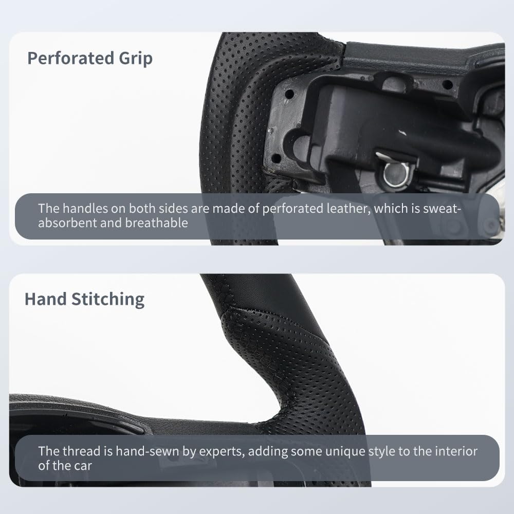 تصميم فريد من نوعه: هناك أخاديد غير قابلة للانزلاق خلف عجلة القيادة ، والتي يمكن أن تزيد من احتكاك الأصابع لمنع عجلة القيادة من الانزلاق. يتبنى المقبض الجلود المثقبة ، مقاومة للارتداء وصديق للبشرة ، مما يمنحك تجربة قيادة أفضل. الخيط المربح يدويًا من قبل الخبراء ، ويضيف بعض الأسلوب الفريد إلى الجزء الداخلي من السيارة