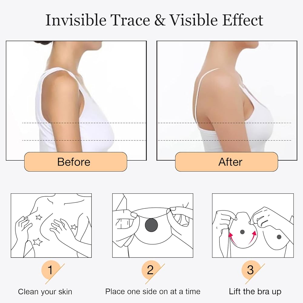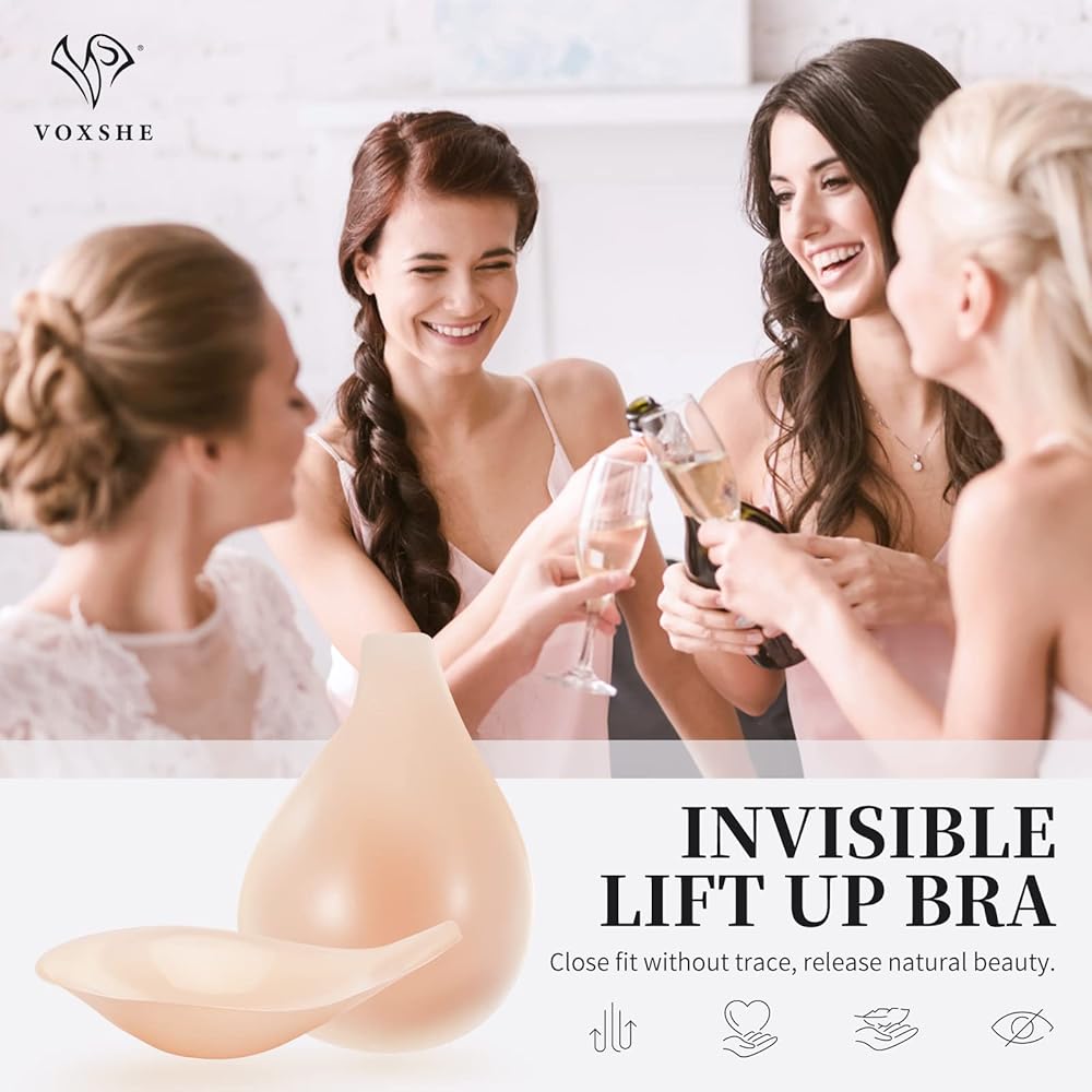 • *مقاومة للماء ومضادة للانزلاق* - حمالة الصدر لاصقة للغاية وتبقى في مكانها جيدًا لتجنب السقوط. يمكن استخدام حمالة الصدر غير المرئية عدة مرات، وغسل السطح بالماء الدافئ ومنظف خفيف، ثم الهواء لتجفيفها. حمالة صدر ذاتية اللصق بدون حمالات يمكن إعادة استخدامها حتى 30 مرة! )