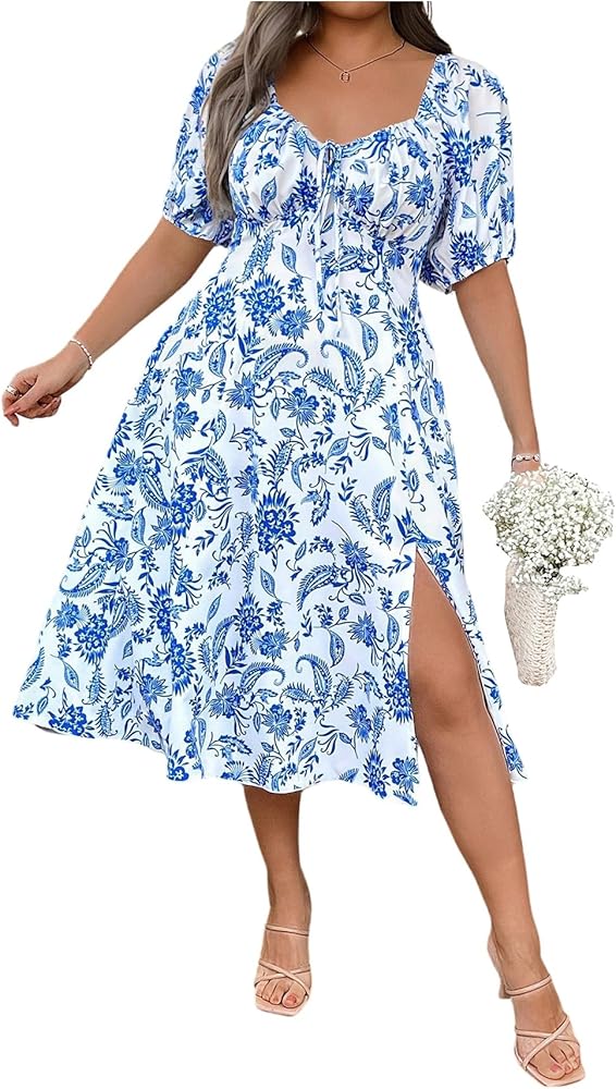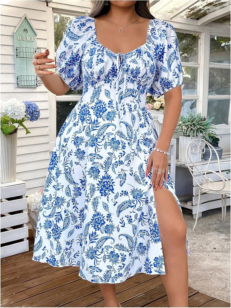 - طباعة زهور، صدر مكشكش، رقبة مربعة، أكمام قصيرة منتفخة، حاشية مشقوقة، فستان متوسط الطول