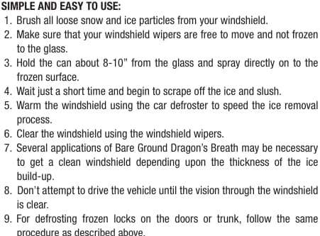 Harness the power of a dragon's breath in Bare Ground windshield deicing spray. With an easy to use 16oz aerosol can that utilizes a non flammable nitrogen Propellant, Bare Ground dragon's breath uses the same potassium formate deicing liquid that airports spray on runways for a superior deicing that biodegradable and gentle on all surfaces. It stores easily in your car for the cold mornings when your windshield is covered with ice and you just want to get going. Just spray on and watch the ice melt away. No need to turn up your defroster and let your car run to melt the windshield ice. Saves time, energy and the environment. Great for frozen locks too.