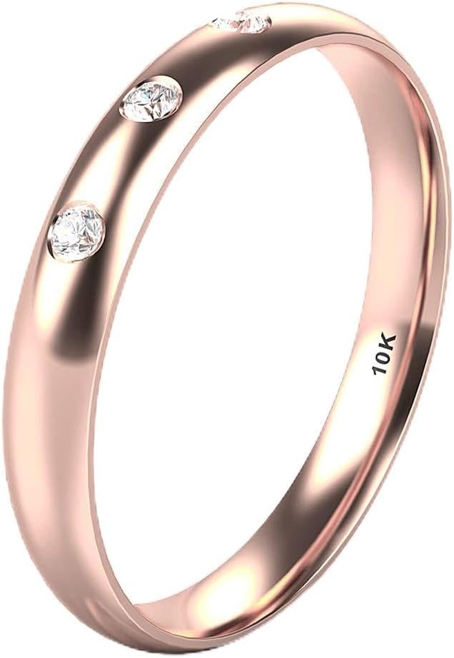This classy 10k solid gold wedding band ring has 3 round brilliant diamonds in bezel settings which weighs 0.015 carats each. It measures 3mm in width and has a high polish mirror-like shiny finish on the surface. It comes in an elegant ring box and it has a 10k stamp on it to indicate its authenticity. It never tarnishes or turns color.