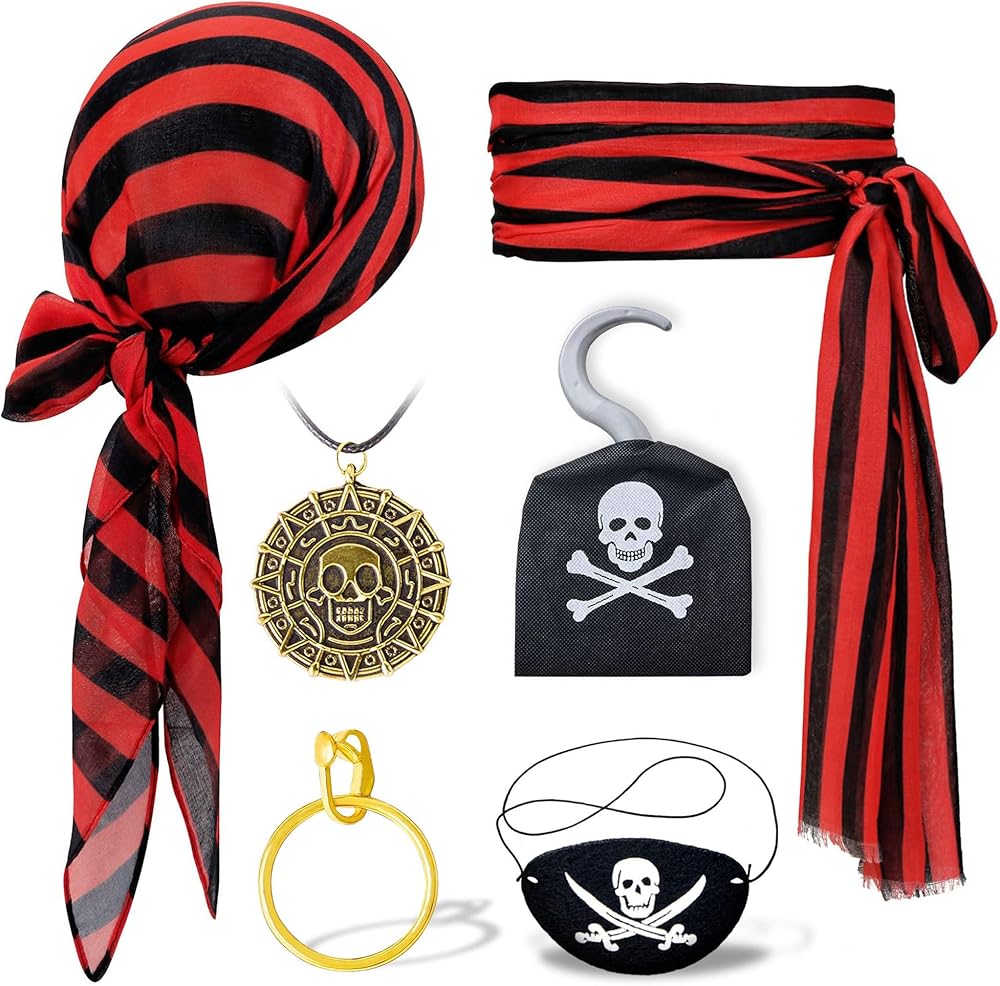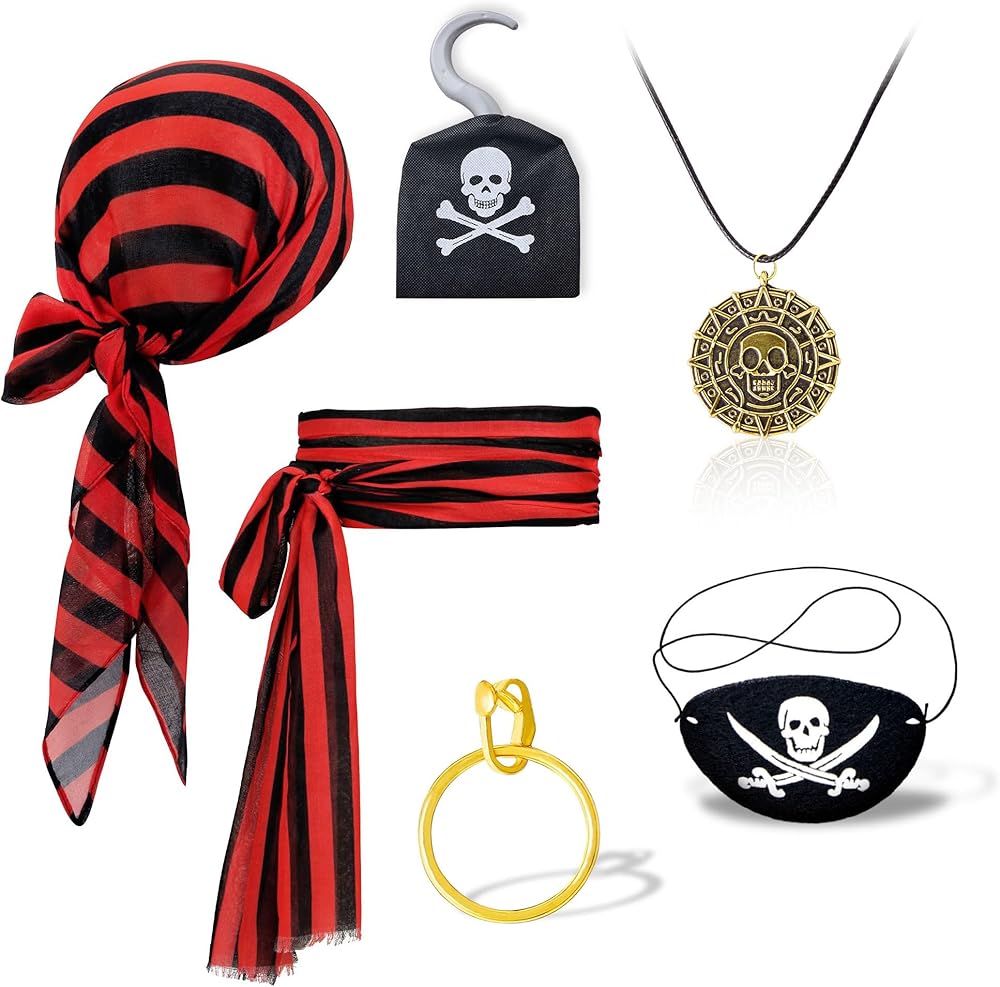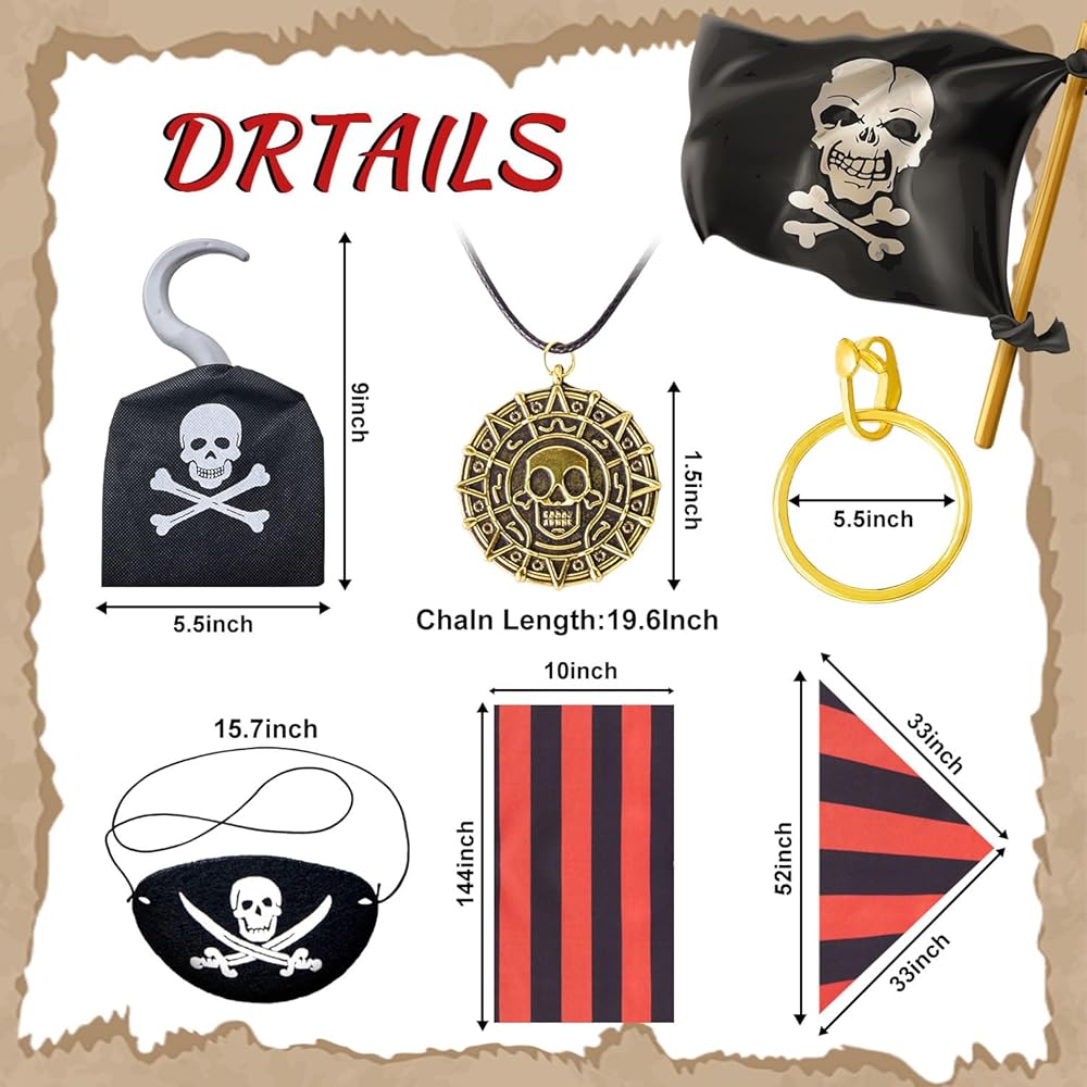• مجموعة الملحقات القراصنة : قطعة واحدة من القراصنة باندانا ، قطعة واحدة من القراصنة وشاح كبير ، قلادة قطعة واحدة ، تصحيح العين 1 قطعة ، قرط واحد ، 1 PCS Hook.