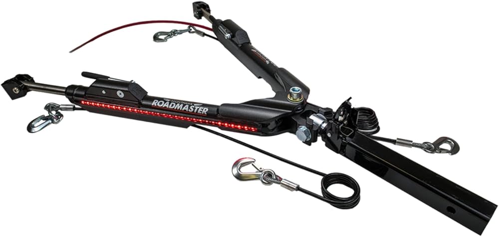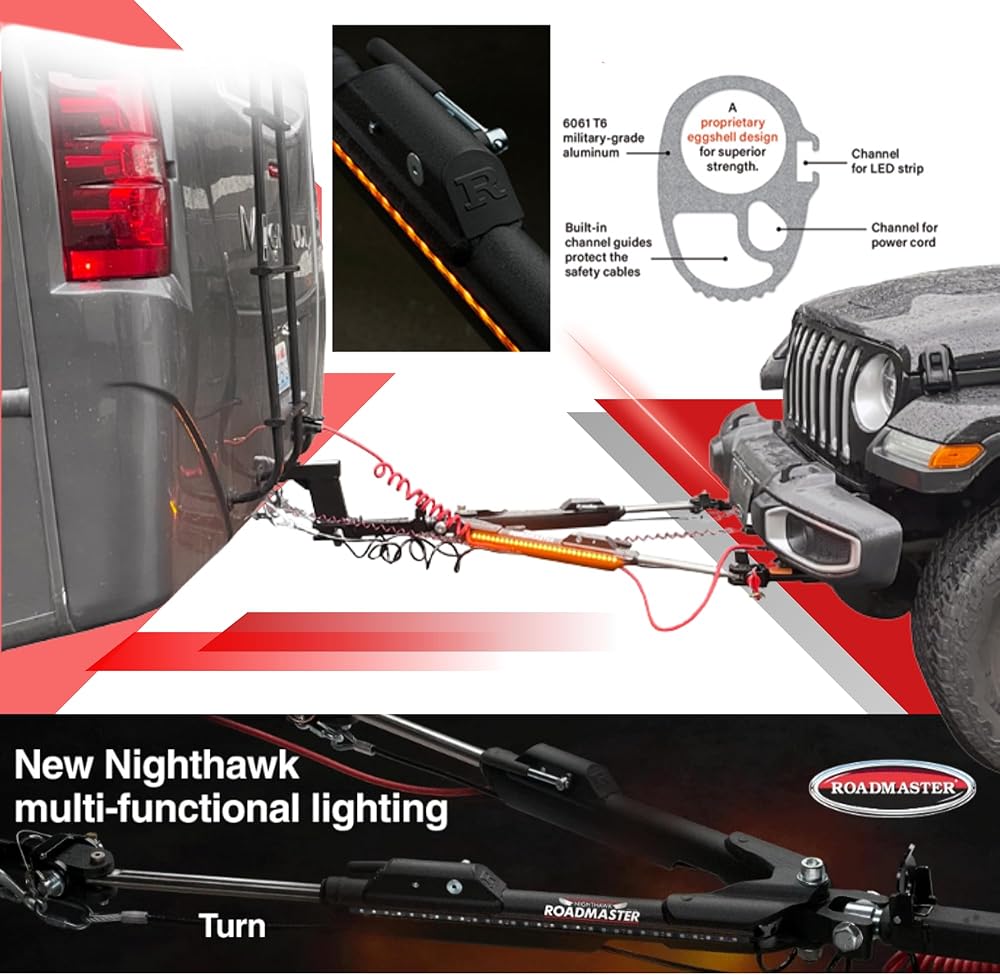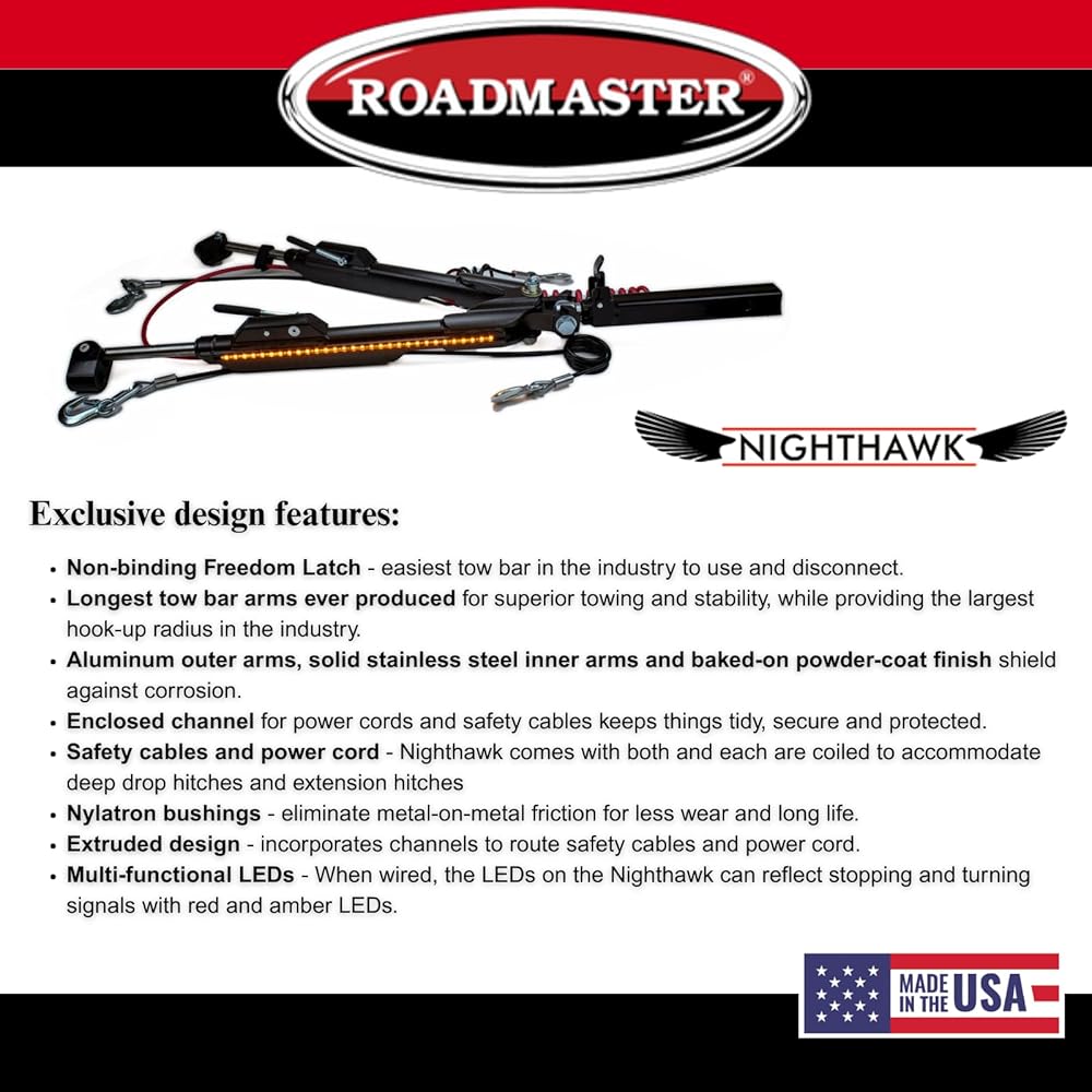 The Sterling All-Terrain was designed, tested and manufactured to the highest standards. Weighs just 35 pounds, yet pulls up to four tons. Steel and stainless steel at every critical point ensure superior strength and structural integrity. An eggshell design, unique to the Sterling All-Terrain and the Nighthawk distributes pressure throughout the tow bar, making them the world's strongest aluminum tow bars. The Sterling All-Terrain is easy to connect, and its solid stainless steel inner arms telescope, center and automatically lock as you pull away. Once you've reached your destination, a unique storage lock secures the tow bar in its stored position. The Sterling All-Terrain comes complete with safety cables and power cord. Both are routed through a channel for added safety, convenience and a clean, uncluttered appearance. Beyond its many performance features, the Sterling All-Terrain is aesthetically pleasing — its stainless steel, metal-flake, powder-coated finish and sleek design complement your motorhome and your towed vehicle. Other performance and convenience features include: Freedom Latch — disconnects first time, every time. Nylatron bushings eliminate metal-on-metal friction for longevity and a smoother ride, Solid stainless steel inner arms — for smooth, trouble-free operation, Channel guides — support and protect the included safety cables and power cord, Pinless storage latch — easily folds and stores. No pin to lose or holes to line up. Fold the tow bar and it automatically locks in place.