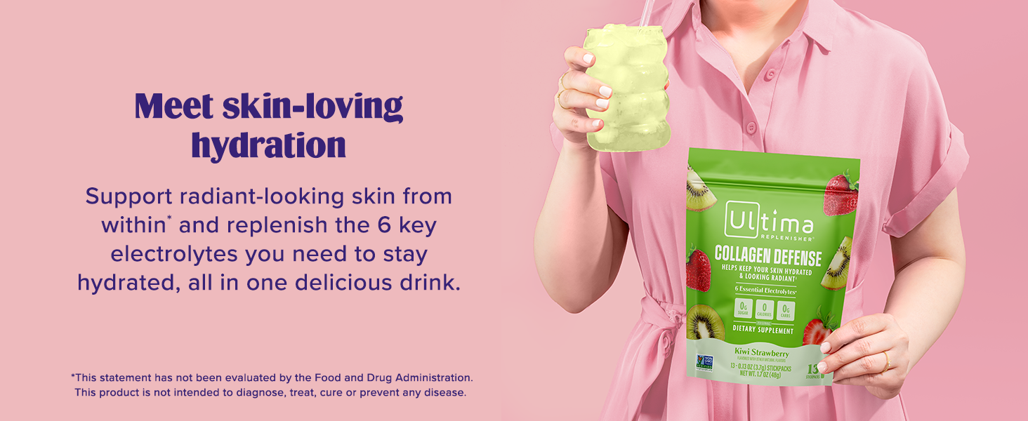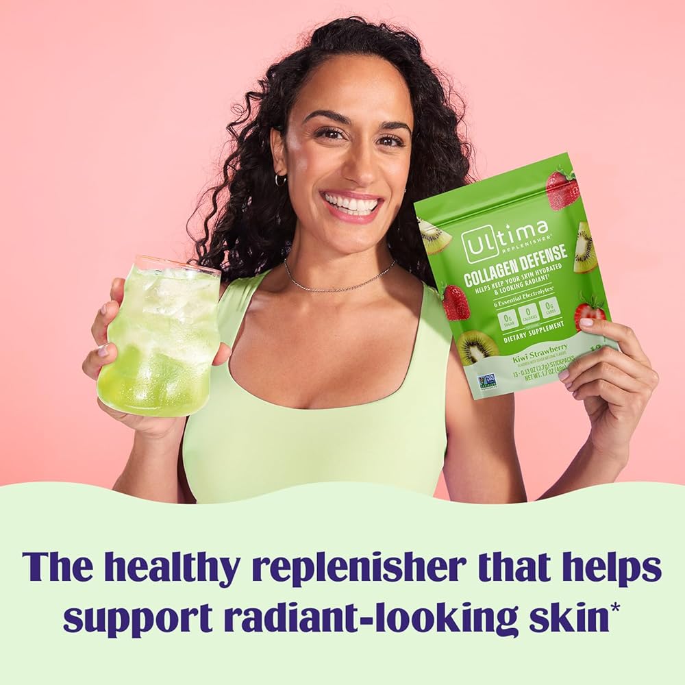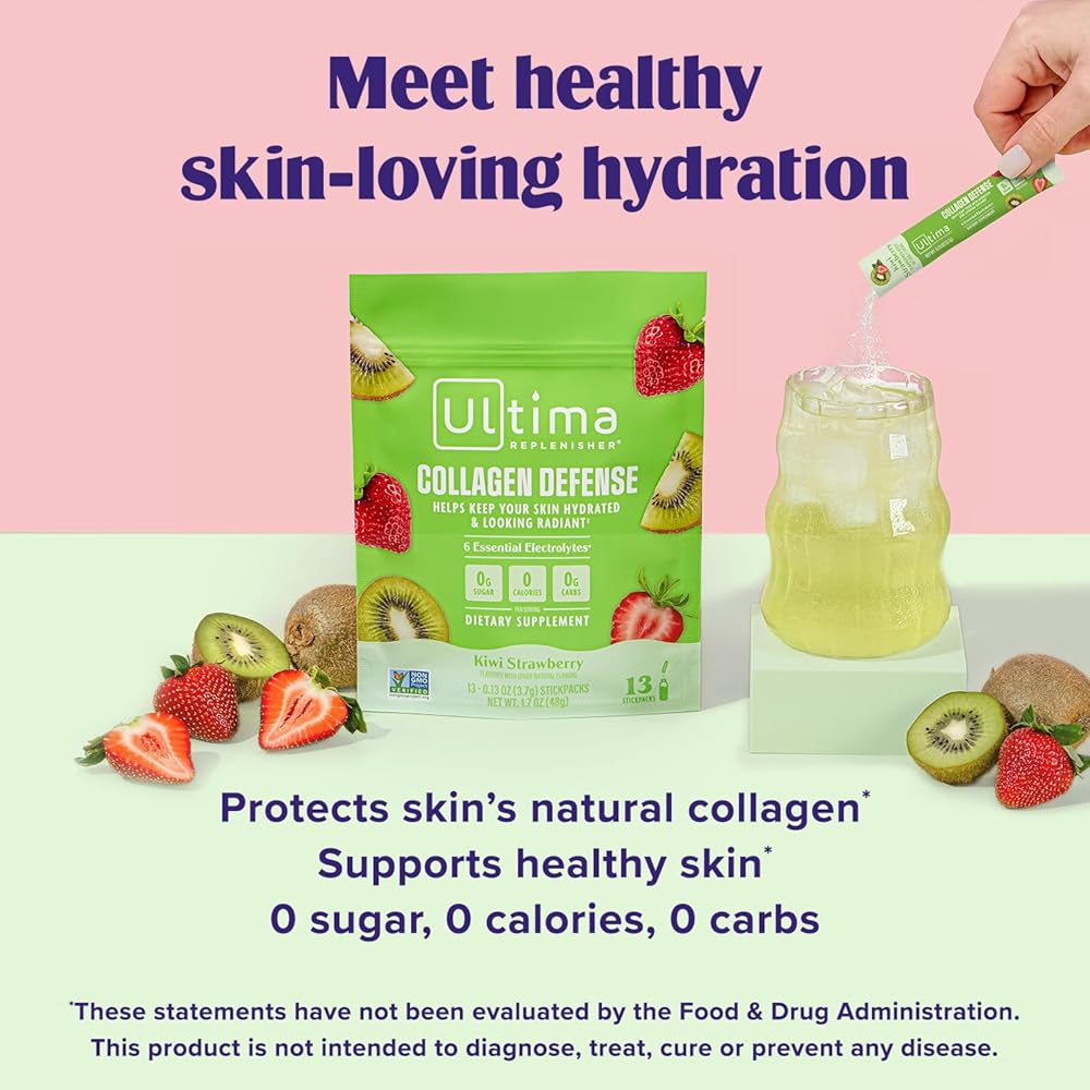 ملحق دفاع الكولاجين في Ultima -collagen ومسحوق الإلكتروليت - الفراولة Kiwi ، 13 حزمًا - حزم ترطيب مع Dermaval و Biotin التي تحافظ على ترطيب بشرتك ومظهر مشع