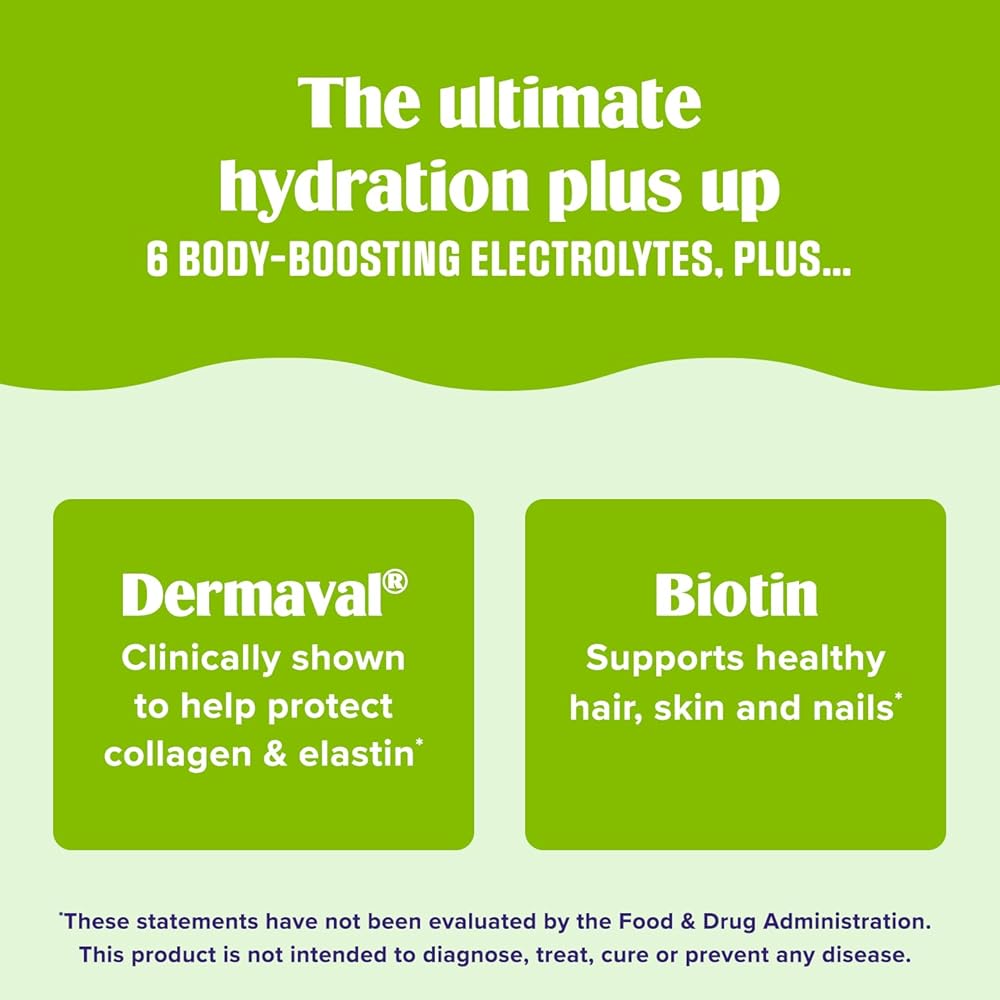 لذيذ منعش: نكهة الفراولة Kiwi المحلية بشكل طبيعي مع البيوتين لدعم صحة الجلد والشعر والأظافر بالإضافة إلى مركبات معروفة لتحفيز إنتاج الكولاجين*؛ جنبا إلى جنب مع الشوارد Ultima ، المغنيسيوم ، الكالسيوم ، البوتاسيوم ، الكلوريد ، الفوسفور والصوديوم