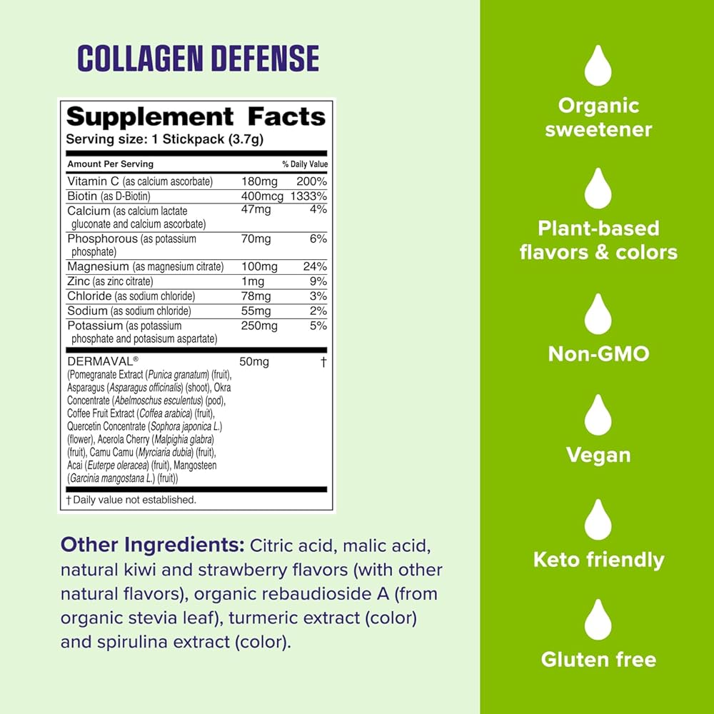 ترطيب طريقك إلى حب الجلد: حزم مسحوق الكولاجين الدفاعية توفر ترطيبًا يوميًا مع 6 شوارد رئيسية أو 0 سكر أو السعرات الحرارية أو الكربوهيدرات ؛ مصنوع من Dermaval ، يظهر سريريًا لحماية الكولاجين والإيلاستين*