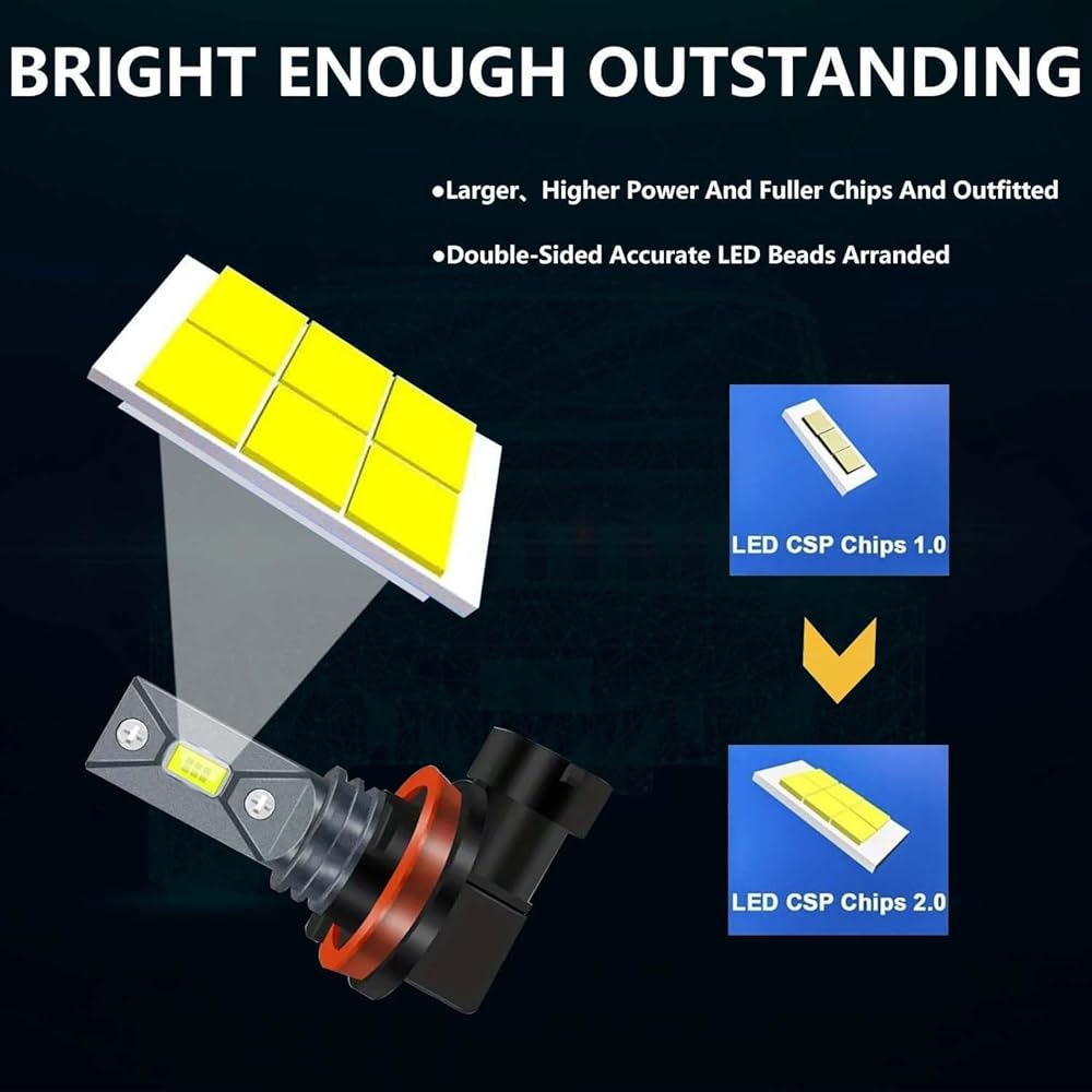 [650 ٪ أكثر إشراقًا من الهالوجين] قوة كل زوج من المصابيح هي 80W. توفر مجموعات مصابيح LED التي تصل إلى 8000 لتر. جودة عالية 3570-CSP LED رقائق أوضح أثناء القيادة في الليل. مع أقصى قدر من التيار ، تتيح لك مصابيح الضباب أن تشعر بالراحة عند القيادة في الليل ، والممطرة ، والضبابية ، والأيام الثلجية بالسيارة.