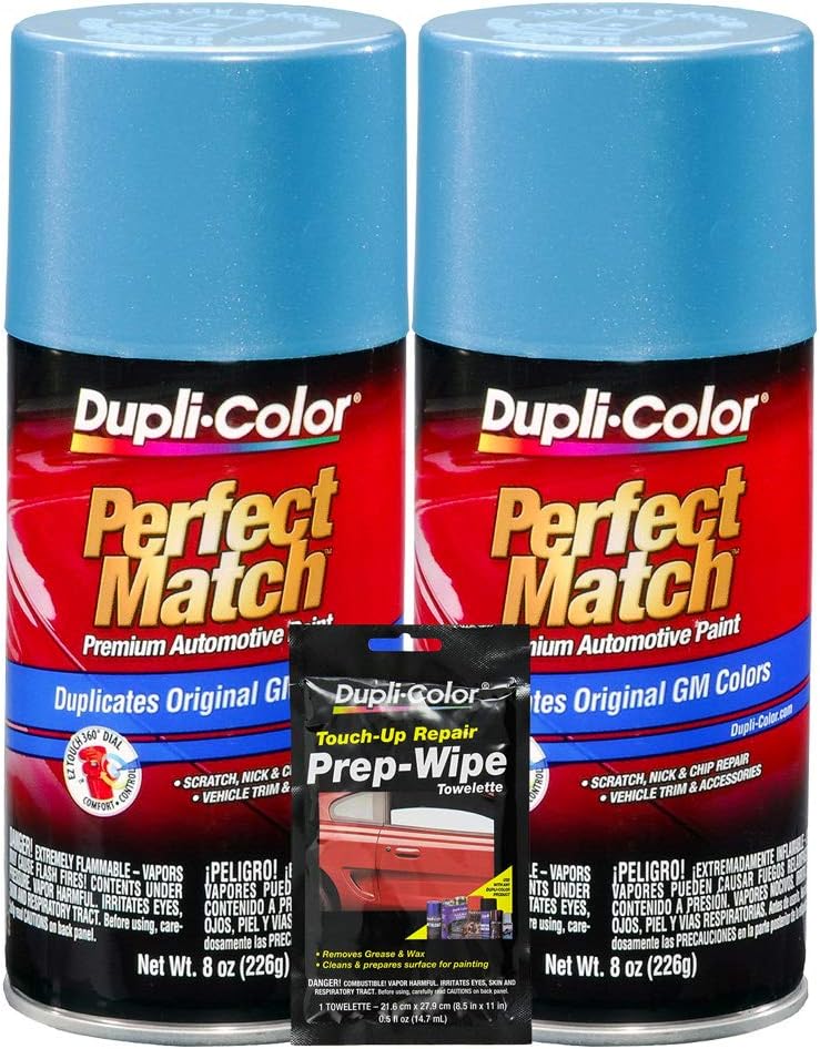This kit comes with 2 - Dupli-Color (BGM0539) Light Blue Metallic General Motors Exact-Match Automotive Paint - 8 oz - Dupli-Color Perfect Match Premium Automotive Paint is an easy-to-use, high-quality, fast-drying, acrylic lacquer aerosol paint specially formulated to exactly match the color of the original factory applied coating. Ideal for use on all OEM paint surfaces, Perfect Match is available in a complete line of exact-match colors for current and late model import and domestic vehicles, making this product ideal for both small scale vehicle touch-up and for painting vehicle accessories. For the final step in the exact color match process and to provide additional gloss and protection, finish with Dupli-Color Perfect Match Clear Coat. Plus comes with 1 Dupli-Color Prep-Wipe Towelette, specially formulated to remove oil, wax, grease, and other contaminants from the surface. A must for any paint project because it cleans and prepares the surface for painting.