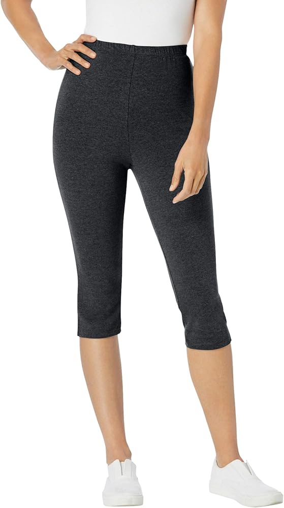 Start a great athleisure outfit with this stretch cotton knit pull-on capri legging. Ideal for everything from lounging to running errands, they offer a comfy, flexible fit that moves with you. The fully covered elastic waistband ensures all-day ease. Their sleek, body-hugging silhouette creates a look that beautifully contrasts with relaxed-fit tops or oversized sweaters. This combo balances comfort and style effortlessly. Plus, the breathable cotton blend keeps you cool and cozy all day long. Perfect for everyday life—whether you're running errands, lounging at home, or socializing. Soft, breathable cotton feels natural against your skin (no irritation, just comfort.). Just the right stretch—spandex moves with you while keeping its shape, so no sagging or bagging. Softer and cozier than nylon-spandex—they are like your favorite tee but in legging form. Sit slightly above the waist. Hem slits. Average: 18" inseam. Petite 16" inseam. Solids: cotton and spandex. Heathers: cotton, poly, and spandex. Easy care—they look great from the first wear and maintain that effect, even after countless washes. Imported S-6X