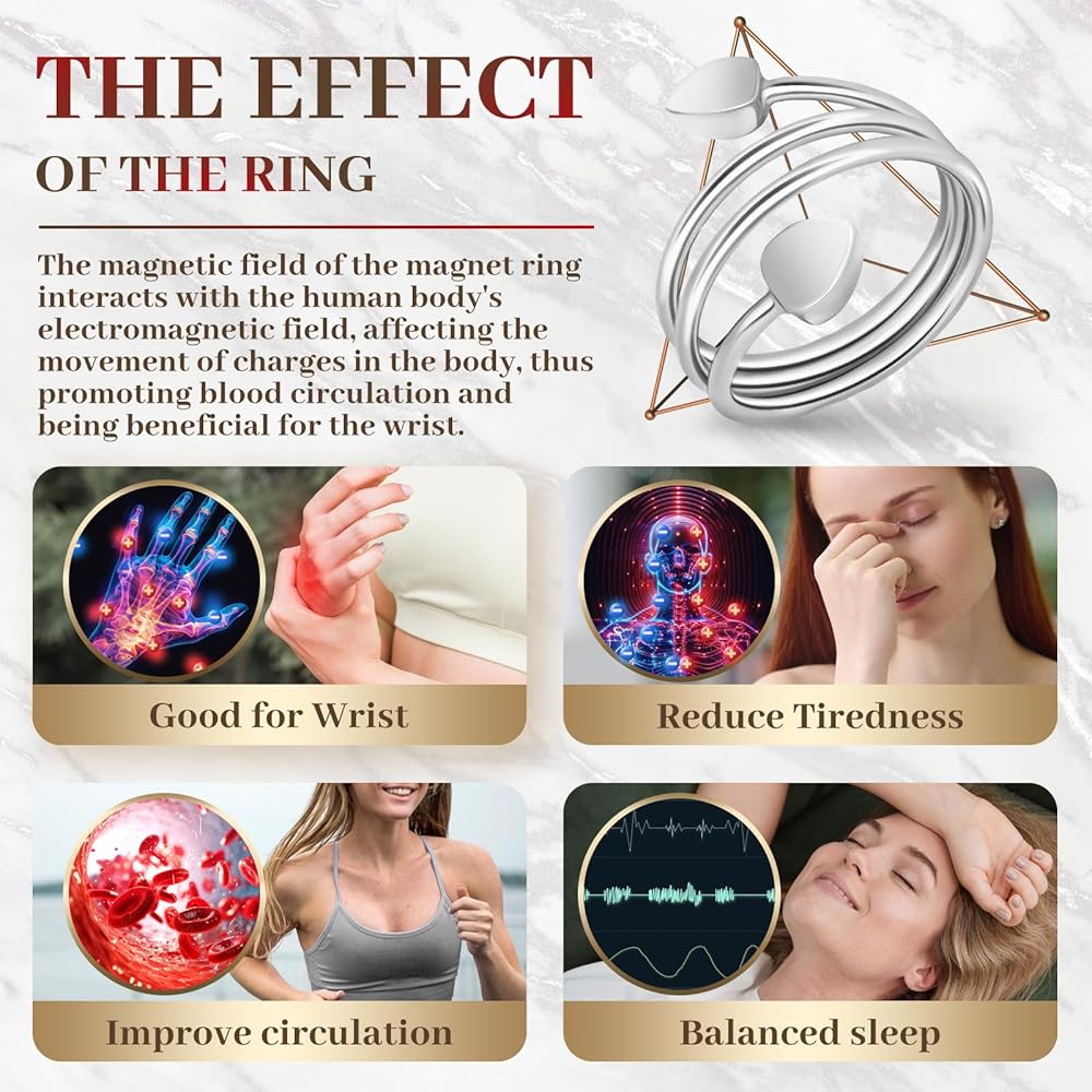 الحلقة المغناطيسية: يتم تضمين الحلقة المغناطيسية النحاسية لدينا مع اثنين من المغناطيس القوي (3500 غاوس) ، أي ما يعادل قوة المغناطيس الصغير. ارتداءه يمكن أن يعزز الدورة الدموية بشكل فعال ، وتحسين إمدادات الدم ، والتخفيف من التعب باليد.