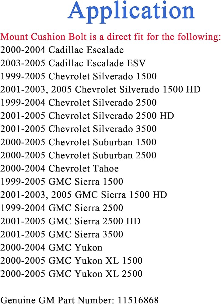 6pcs cab body mount cushion bolt for 1999-2005 Chevrolet Silverado 1500 2500 3500 Tahoe for 1999-2005 GMC Sierra 1500 2500 for 2000-2005 Cadillac Escalade