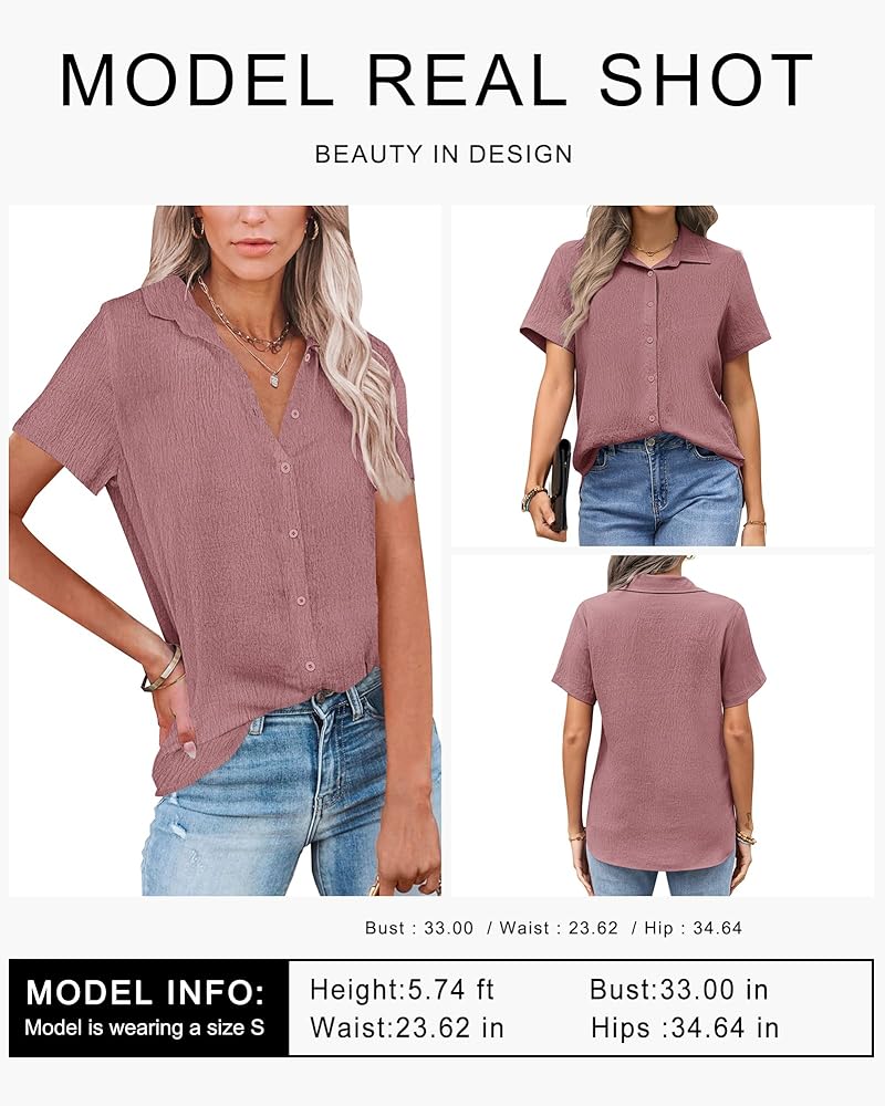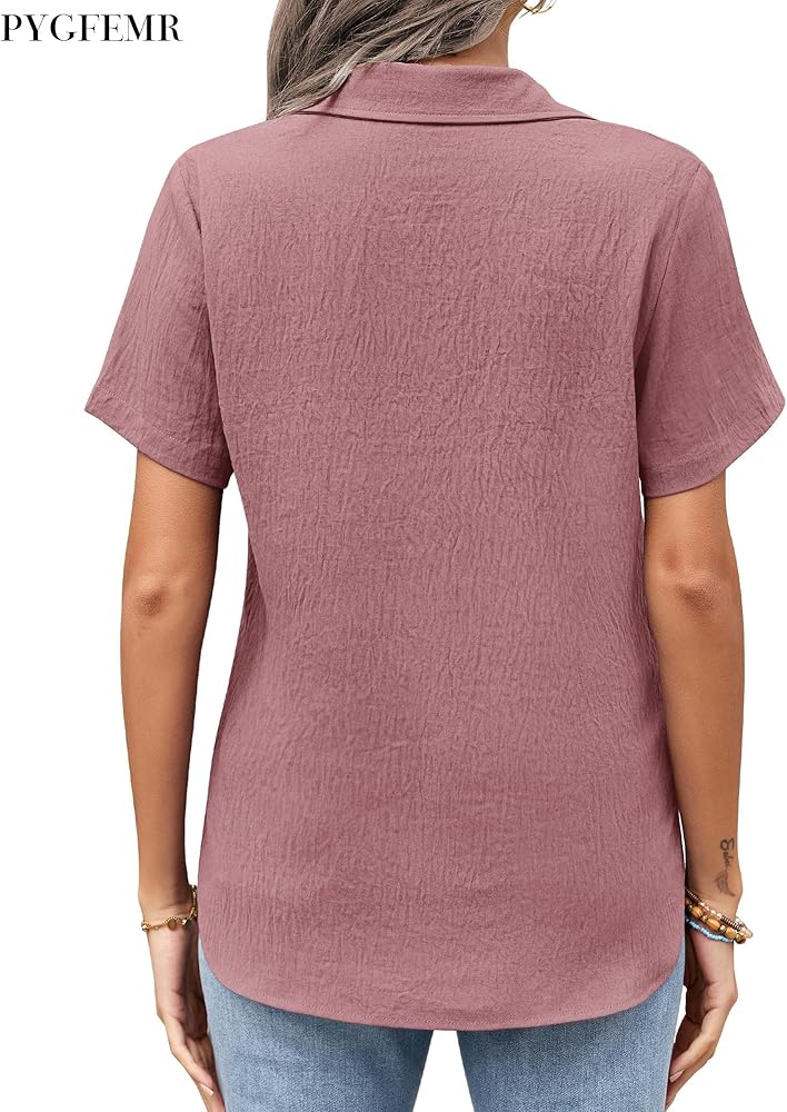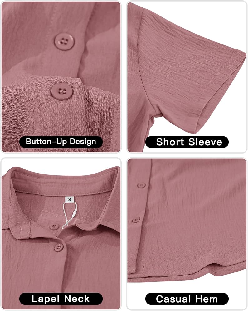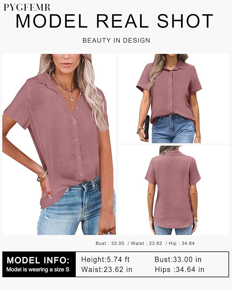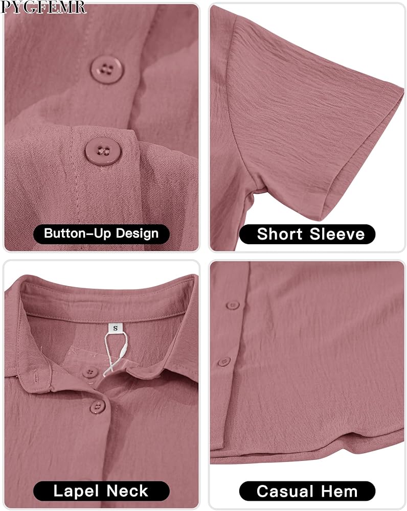 الميزات: تصميم الأزرار ، قميص كلاسيكي من ذوي الياقات البيضاء ، وأكمام قصيرة ، وأسلوب مناسب ، وسهل أساسي. القميص غير الرسمي الصيفي للسيدات يجعلك تبدو أكثر عصرية وأنيقة وأنيقة