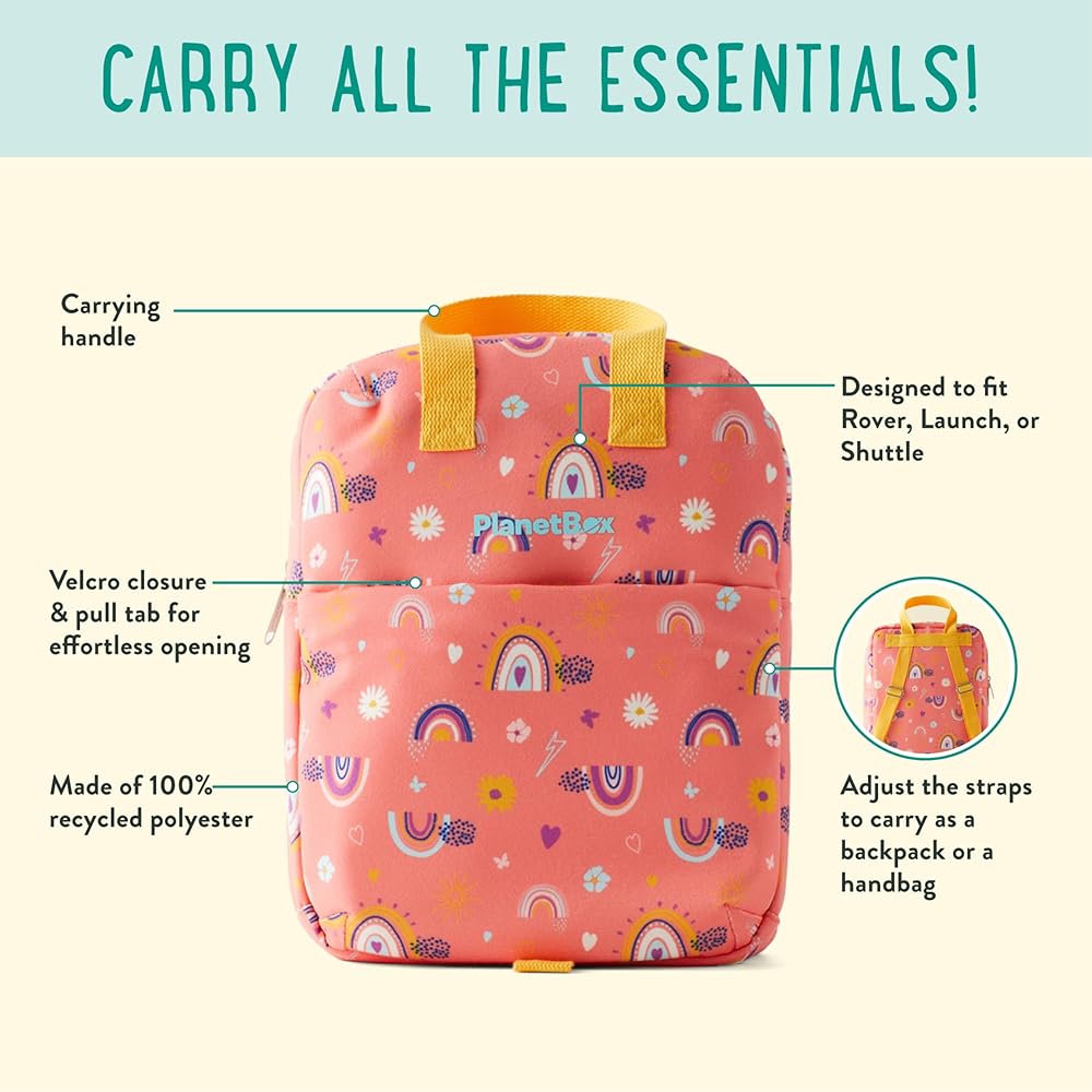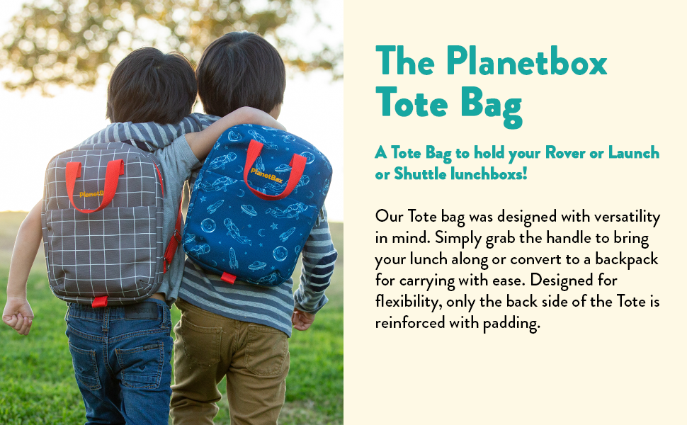 LESS WASTE MORE FUN! The PlanetBox Lunch Tote Bag is a versatile 2-in-1 companion designed for school days and beyond. Crafted from durable, BPA-free, 100 % recycled polyester with a water-resistant interior, it easily converts from a handheld tote bag to a backpack with a padded back panel for comfortable, hands-free carry. Generously sized at 12″×10″×4″, the insulated interior holds lunchboxes, water bottles, snacks, utensils, and ice packs, while interior and exterior pockets help keep everything organized. Machine-wash safe - just pull the bottom tab that flip it inside out-- this bag stands up to spills and adventures alike. When lunchtime's over, flip straps and use it for library runs, playdates, day hikes, travel, and more—the PlanetBox Lunch Tote grows with your child's changing needs, making it the ultimate all-purpose bag.