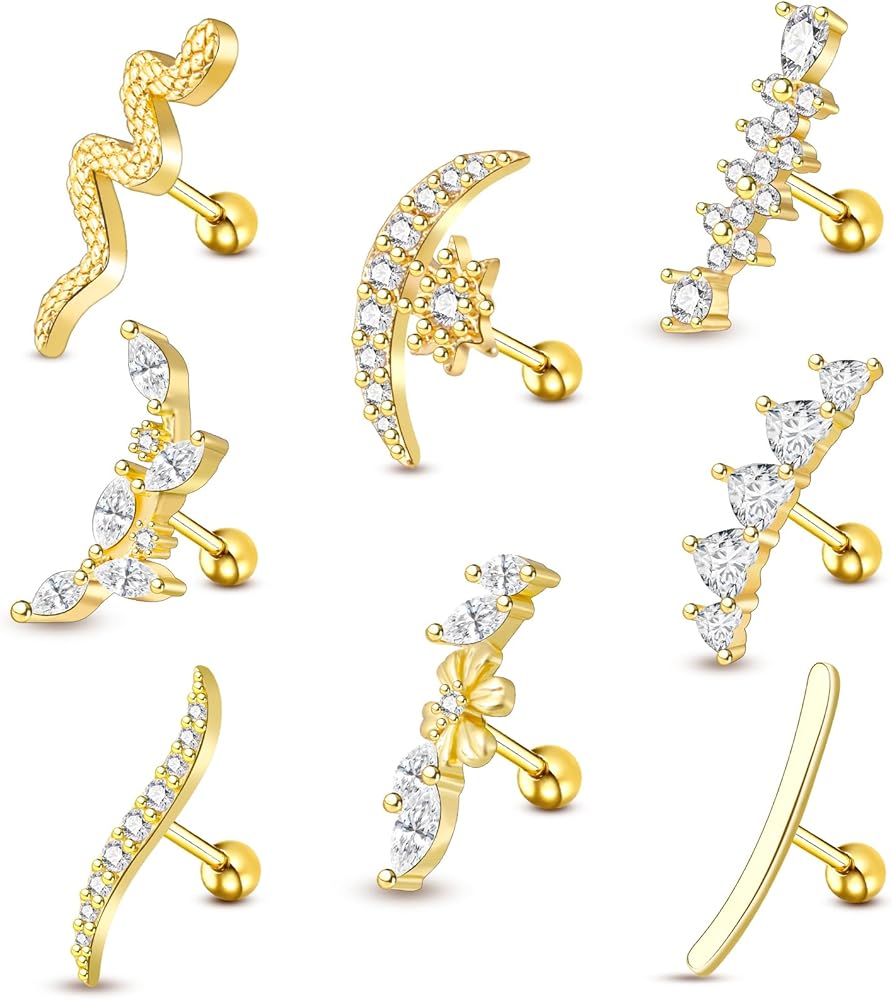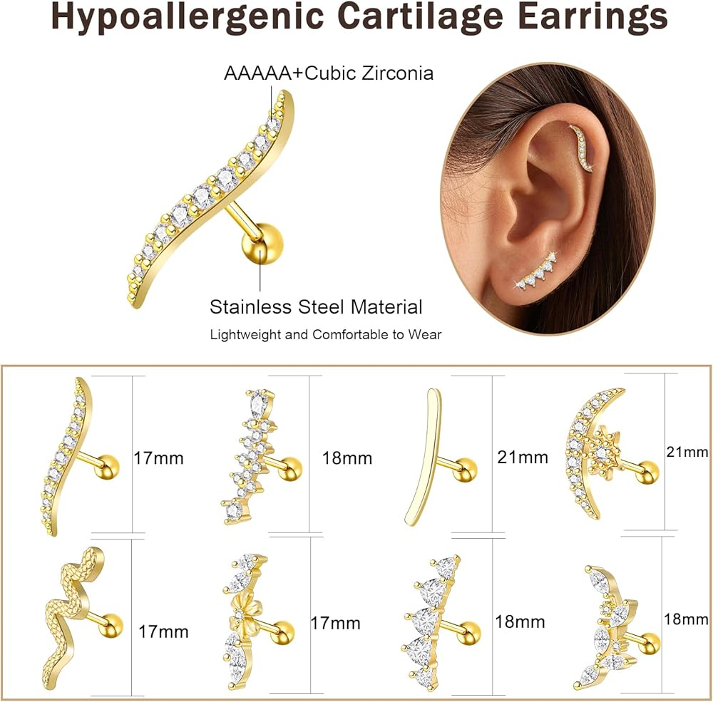 【أقراط الغضروف بأسعار معقولة : سوف تتلقى أقراط غضروف ذهبية 8pcs للنساء في أنماط وأشكال مختلفة ، وتشمل الأفعى والزهور والورق والقمر والفراشة والمزيد من الأنماط الأخرى. إنها لطيفة للغاية وجميلة. مجموعة متنوعة جيدة من اختيارات القرط المختلفة لأي مزاج هو ذلك اليوم.