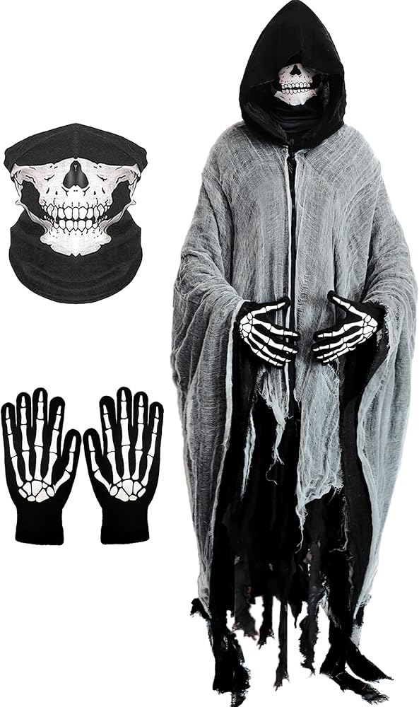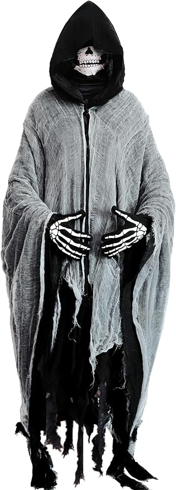• أزياء هالوين عباءة: أزياءنا القاتمة للبالغين القادمين مع قطعة واحدة من عباءة سوداء ، وزوج واحد من القفازات الجمجمة وقطعة واحدة من قناع الهيكل العظمي ، و 3 في 1 أزياء الهالوين يمكن أن تلبي احتياجاتك من الرعب والغموض في وقت واحد ، لا داعي للقلق بشأن كيفية مطابقتك مع زي Cosplay Cosplay.