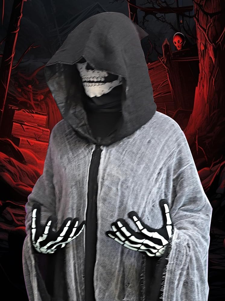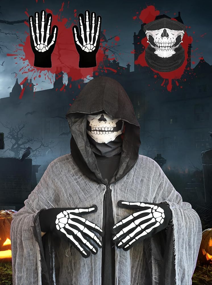 • Skull Mask & Gloves: مجموعة تأثيري للبالغين الأسود Cloak مع قناع جمجمة مخيف وقفازات جمجمة ، مناسبة لارتداء عيد الهالوين أو التقاط الصور ، مما يخلق جوًا مخيفًا. ويمكن استخدام قناع الجمجمة بعدة طرق ، مثل الأقنعة وعصابات الشعر وعصابات الرسغ ، وجعل حزبكم أكثر برودة وخاصة.