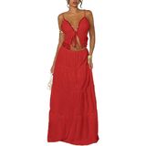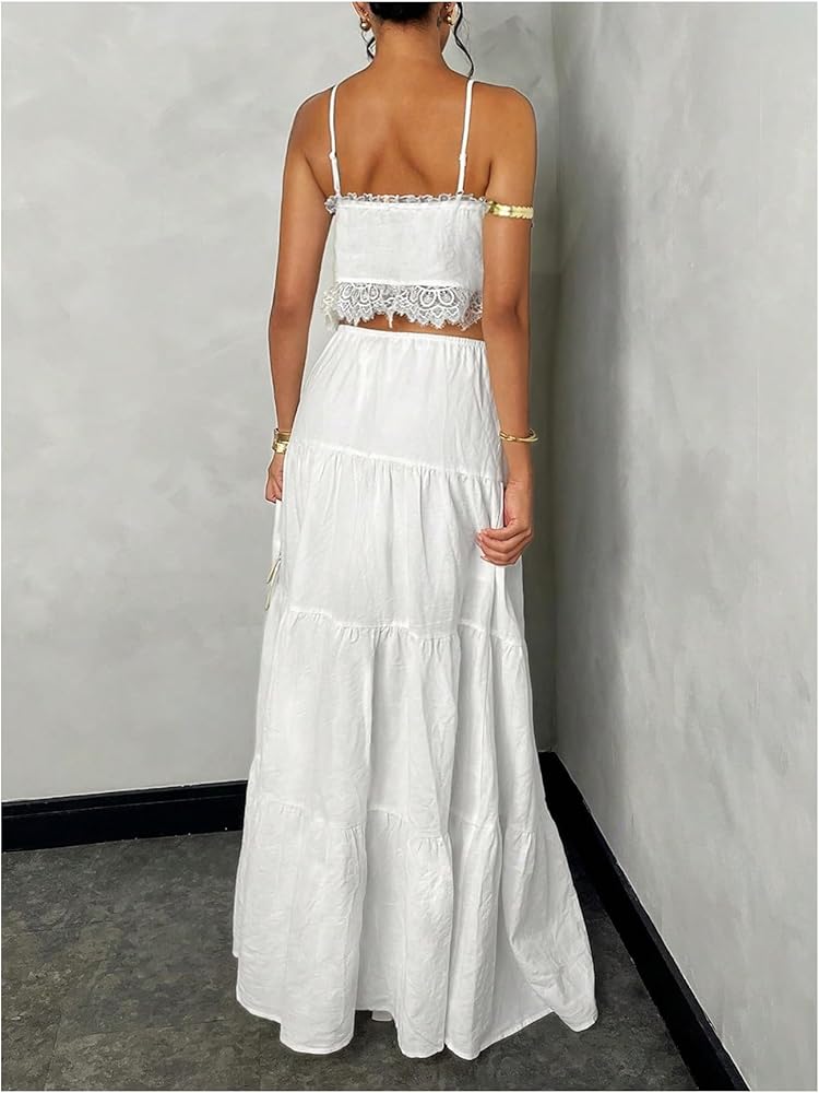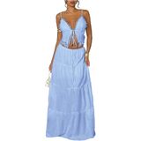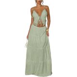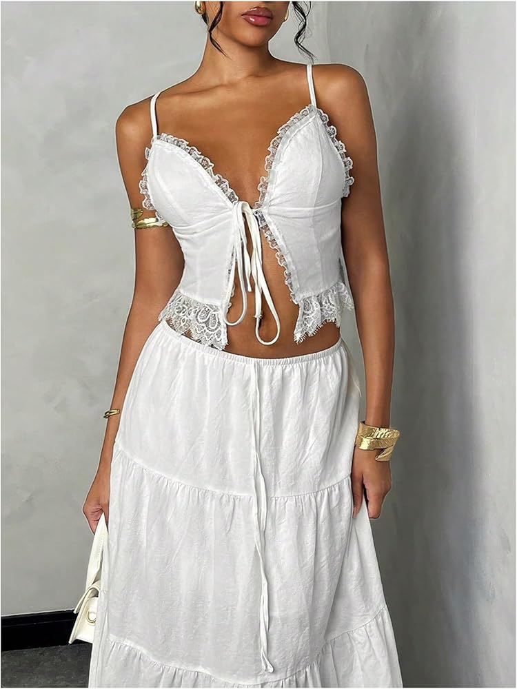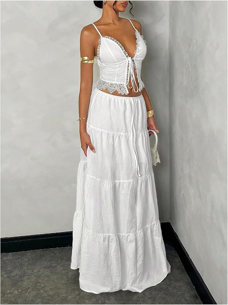 • Design: Spaghetti strap, lace trim, v neck tie front, cami tank top, tiered long skirts, two piece outfit