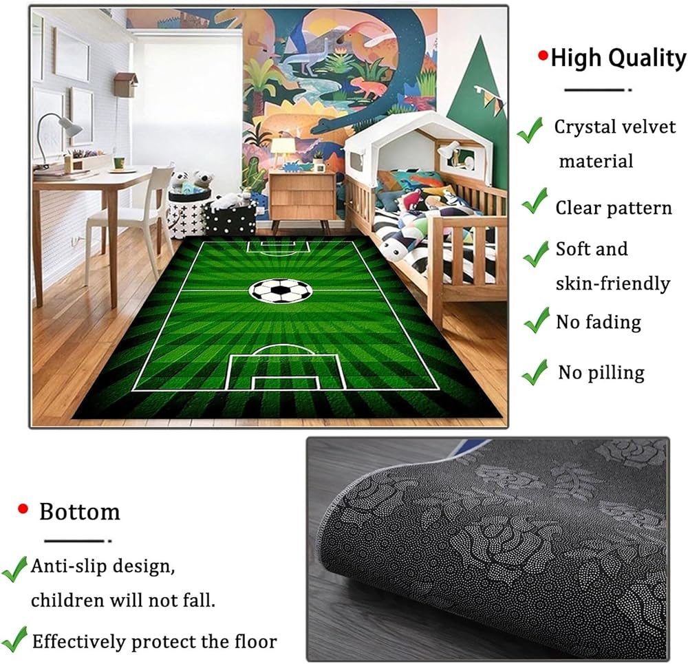 • ⚽【 مفهوم التصميم الجديد】 تم تصميم السجادة مع كرة القدم والرياضية كموضوع. لا يمكن أن تجلب أطفالك إلى ملعب كرة القدم فقط ، ولكن أيضًا إلهام حماس الأطفال وحبهم لكرة القدم. إنه خيار رائع لتزيين غرفة كرة القدم.