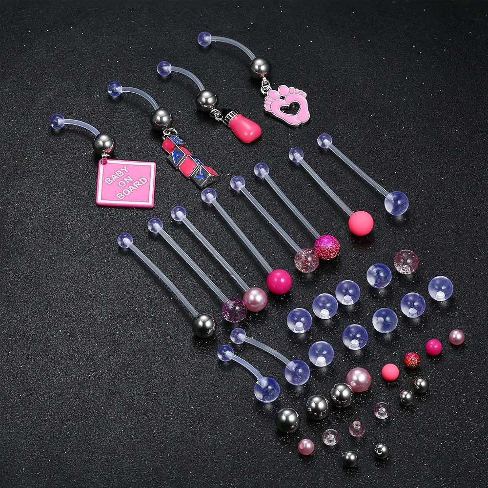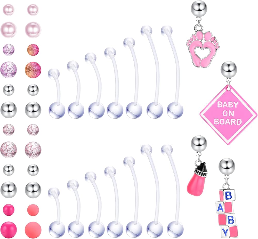 🤰【عبوة قيمة】سوف تحصل على 14 قطعة من حلقات زر البطن البلاستيكية للحمل + 12 زوجًا من الكرات المختلفة + 4 قطع من قلادات الأطفال الزرقاء اللطيفة للاستبدال. تعتبر حلقات زر البطن بيوفليكس الطويلة رائعة كحلقات بطن الحمل أو مجوهرات ثقب البطن الرياضية