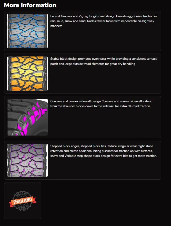 Lateral Grooves and Zigzag longitudinal design Provide aggressive traction in rain, mud, snow and sand. Rock-crawler looks with impeccable on-highway manners