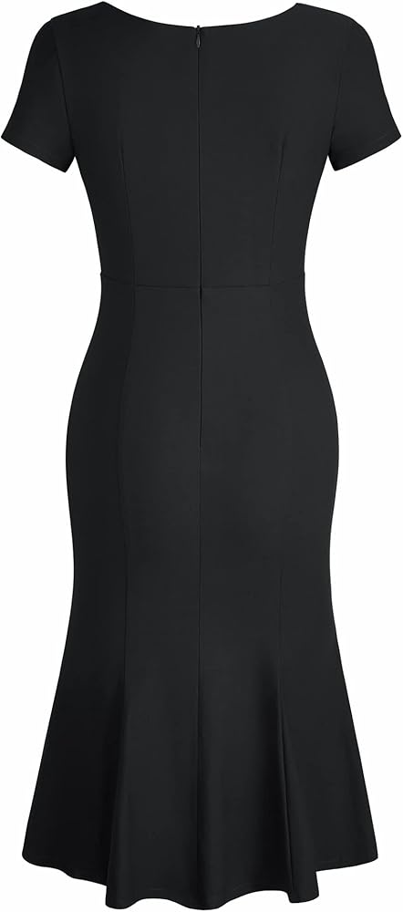 الميزات - أكمام قصيرة، رقبة على شكل حرف V ملفوفة صناعيًا، تصميم أنيق على شكل حورية البحر، مقاس أنثوي وجذاب، صورة ظلية غمد، فستان بطول الركبة، سحاب خلفي مخفي. طراز الفساتين الكلاسيكية والكاجوال، يجعل محيط خصرك يبدو أكثر أنحف وملاءمة للشكل