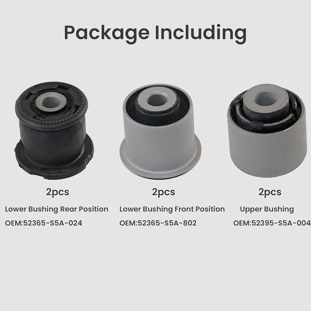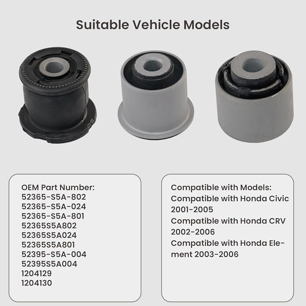 • 【Fitment】The rear lower control arm knuckle bushing kit is compatible with Honda Civic 2001, 2002, 2003, 2004, 2005, Crv 2002, 2003, 2004, 2005, 2006, Element 2003, 2004, 2005, 2006.