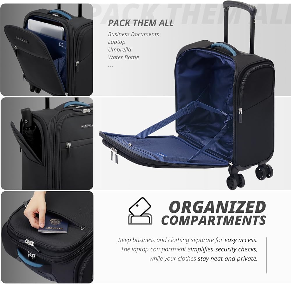 • Verage Underseat Carry On Luggage: تتميز حقيبة Softside الصغيرة بتصميم مضغوط يناسب بسهولة معظم مقاعد الطائرات ، مما يجعلها مريحة للمسافرين أثناء التنقل. مجهزة بعجلات ناعمة للدوران ، تنزلق حقيبة المتداول بعجلات من خلال المطارات المزدحمة والممرات الضيقة