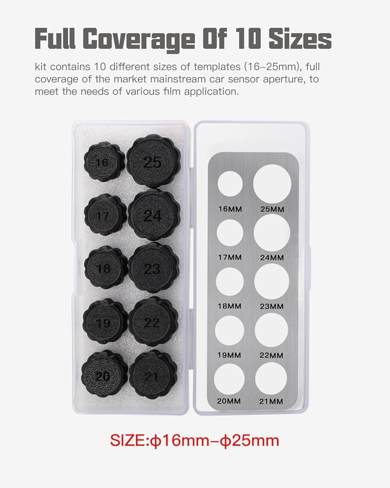 Covers All 10 Sizes:Includes 10 templates ranging from 16mm to 25mm, suitable for nearly all standard parking sensors across different vehicle models