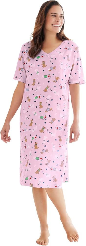 Enjoy ultimate comfort with our Short Print Sleepshirt, made from pure cotton for a soft and cozy feel.Features fun and whimsical prints that bring a touch of joy to your bedtime routine.Relax in style with a ribbed V-neck and short sleeves designed for optimal sleeping comfort.The A-line shape offers a relaxed fit that allows for easy movement and a carefree feel.Perfect for lounging around the house or snuggling up at night, this sleepshirt combines comfort with style.Ideal 40" length provides coverage while maintaining a breezy feel.Easy care – simply machine wash to keep it fresh and ready for your next wear.Imported