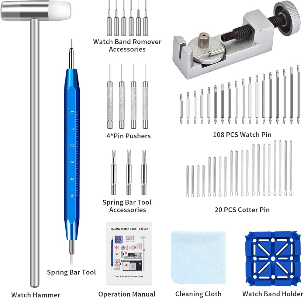 ⌚【أساور ساعة بديلة】تم تجهيز مجموعة إصلاح الساعات هذه بأداة إزالة السوار من الستانلس ستيل و18 مقاسًا من القضبان الزنبركية (0.3 انش - 1 انش)، إلى جانب 3 أطراف أدوات قضيب زنبركي إضافية. تساعدك على إزالة أساور الساعة بسهولة وهي مناسبة لأحجام مختلفة من حافظات الساعات. يضيف إلى استمتاعك باستبدال أساور الساعة.