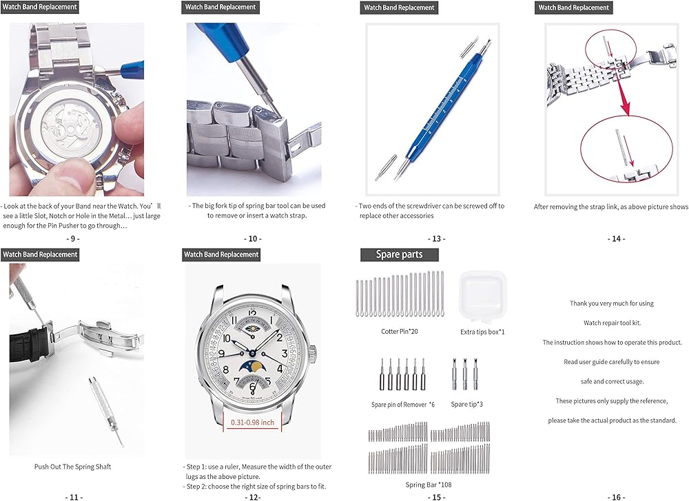 ⌚【سهلة الاستخدام】 تأتي مجموعة إصلاح الساعات مع دليل مستخدم مطبوع يمكن أن يساعد المبتدئين على استخدام هذه الأداة. انتهي من استبدال حزامك المفضل في المنزل، أداة بسيطة بشكل فعال دون تذبذب. مجموعة أدوات إصلاح الساعات هذه هي ما يجب أن يمتلكه كل محبي الساعات. ستكون مجموعة أدوات ضبط حلقات الساعة هذه أفضل هدية لأصدقائك وأحبائك ولنفسك، كما يمكن أن تكون هدية عطلة لمحبي الساعات.