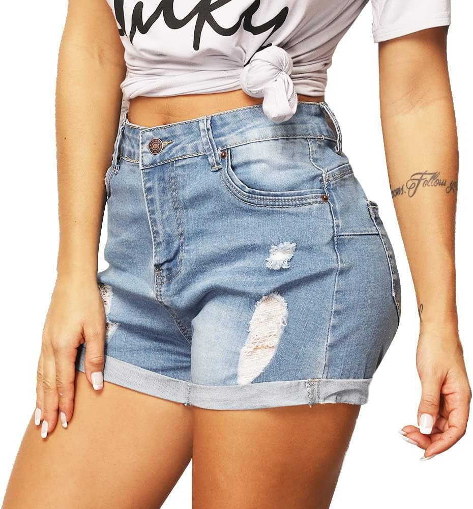 - شورت من الدنيم بحاشية مطوية، زر، شورت من الدنيم ممزق صيفي للنساء، شورت من الدنيم قابل للتمدد، شورت من الدنيم كاجوال للنساء.