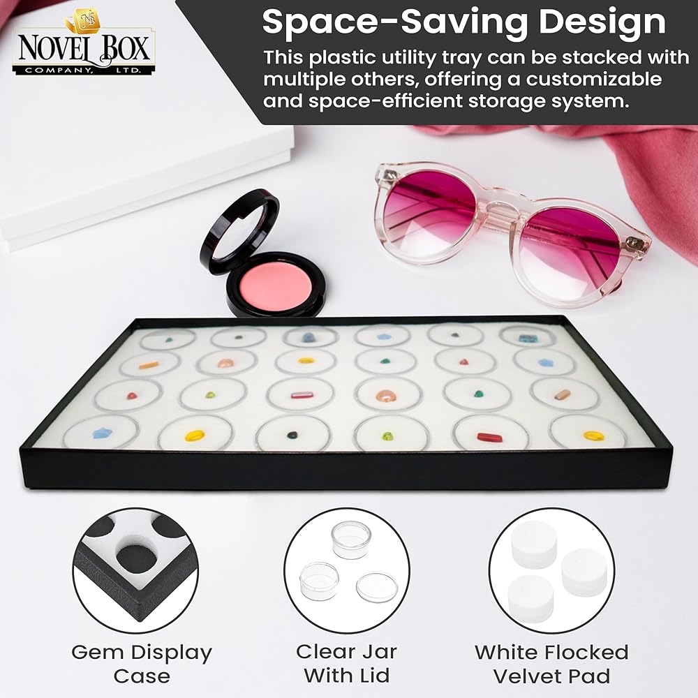 تتضمن المجموعة: تتضمن هذه المجموعة صينية أسود خشبية قابلة للتكديس مع إدراج 50 جرة الأحجار الكريمة. إنه مصمم لتنظيم وعرض المجوهرات أو الأحجار الكريمة أو المقتنيات الصغيرة بشكل آمن ، مما يوفر حلاً مثاليًا للتخزين