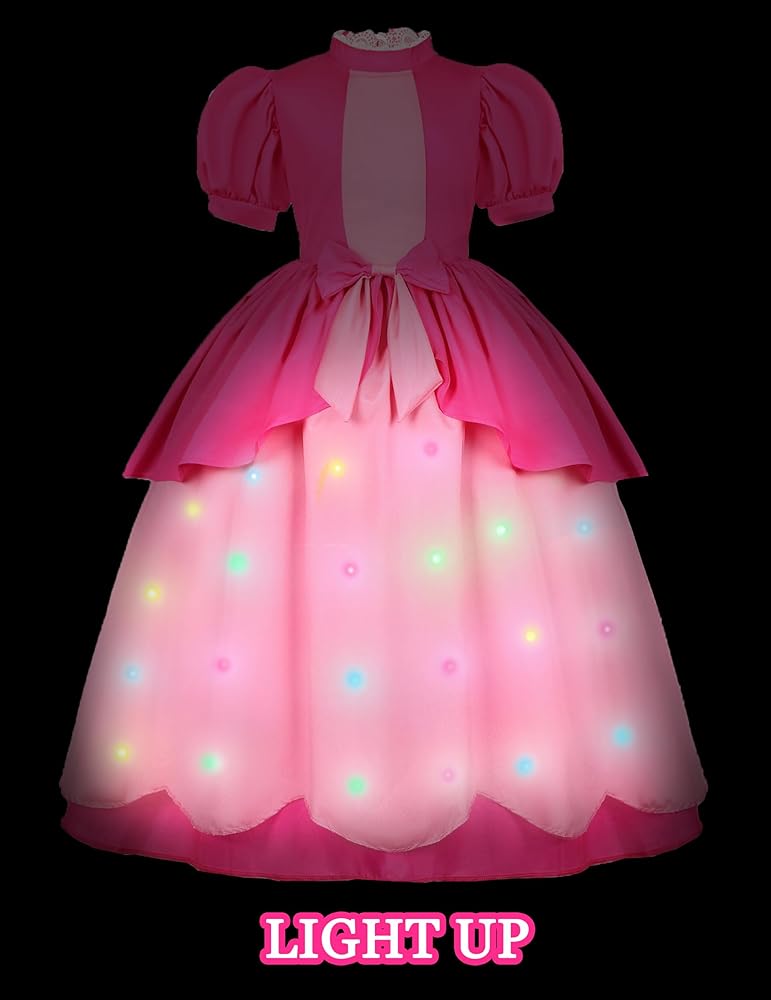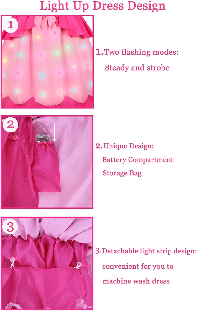 فستان الأميرة الخوخي المضيء: يتطلب بطاريتين AA (غير متضمنتين). يوجد شريط إضاءة ملون مدمج. وضعين - متوهجة ثابتة أو ستروب ساحر. سوف تكون فتياتك موضع التركيز عندما يضيء الفستان