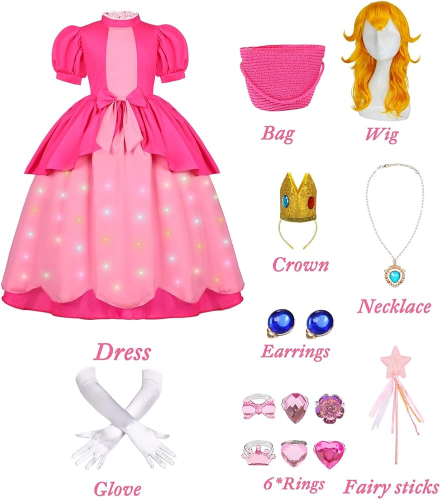 تتضمن مجموعة أزياء الأميرة الخوخية للفتيات ما يلي: 1 × فستان الأميرة الخوخي المضيء، 1 × شعر مستعار للأميرة الخوخية للأطفال، 1 × تاج الأميرة الخوخي، 1 × حقيبة، 1 × قلادة، 1 × عصا، 1 × قفازات، 1 × أقراط، 6 × الخواتم وجميع الملحقات الخاصة بزي Pincess Peach