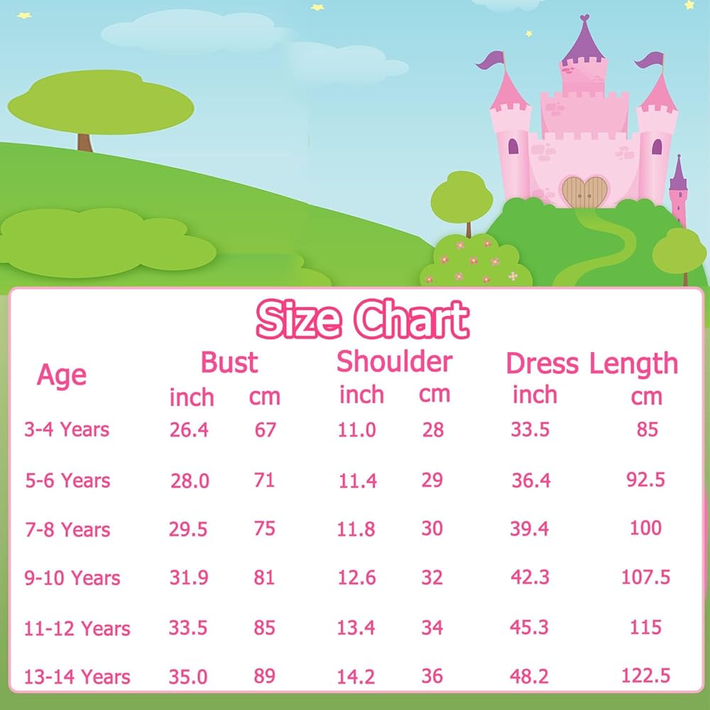 المقاس: زي الأميرة الخوخ للفتيات الخاص بنا مناسب للأعمار من 3 إلى 14 عامًا. يُرجى الاطلاع على جدول المقاسات للحصول على التفاصيل قبل الطلب