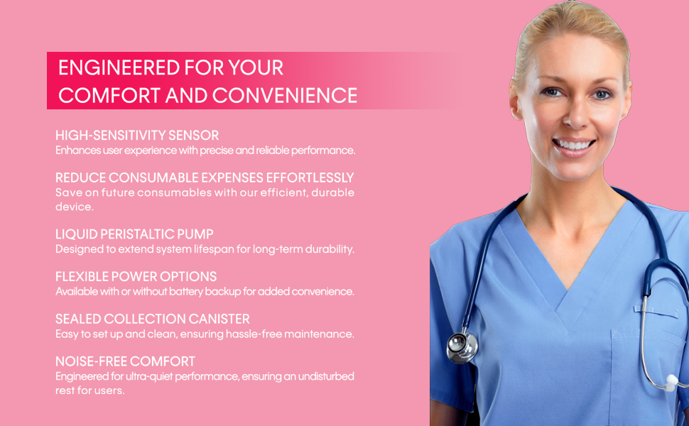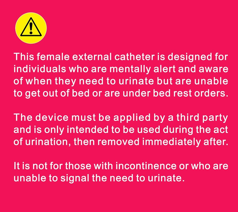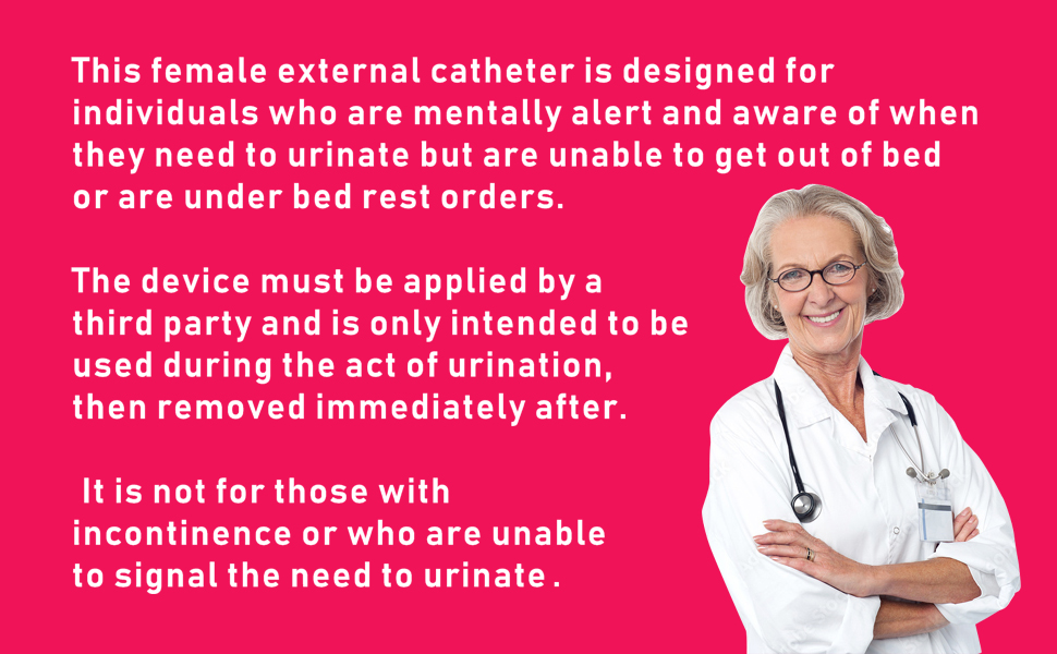 تم تصميم هذه القسطرة الخارجية الأنثوية للأفراد الذين يتناسبون عقلياً ويدركون عندما يحتاجون إلى التبول ولكنهم غير قادرين على الخروج من السرير أو تحت أوامر الراحة في السرير. يجب تطبيق الجهاز من قبل طرف ثالث ولا يُقصد استخدامه فقط أثناء فعل التبول ، ثم إزالته مباشرة بعد ذلك. ليس لأولئك الذين يعانون من سلس البول أو الذين لا يستطيعون الإشارة إلى الحاجة إلى التبول