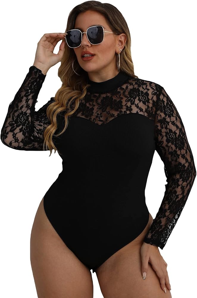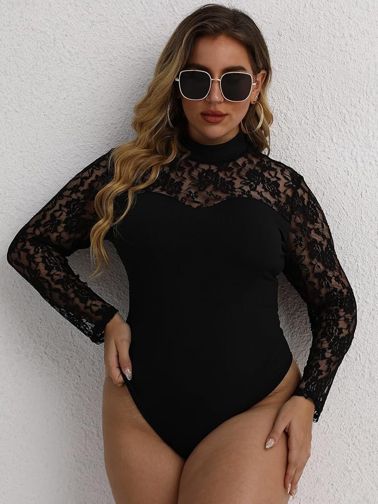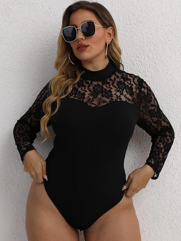 بدلة نسائية WDIRARA مقاس كبير من الدانتيل برقبة وهمية شبكية وأكمام طويلة