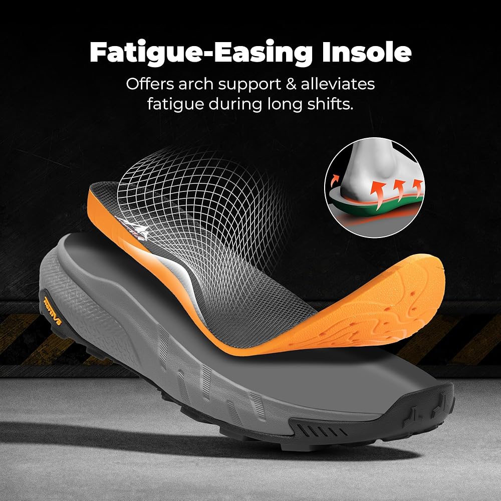 التصميم الذي يقلل من التعب: تأتي أحذية عمل هذه الرجال مع نعل مرن لدعم القوس وعلب إيفا الداعم الذي يخفف من التعب. توفر أحذية هذه الرجال دعمًا دائمًا للأشخاص الذين لديهم عمال بناء أثقل ، وعمال البناء ، وسائقي الشاحنات ، والكهربائيين ، وموظفي الأمن ، وعمال المناجم ، والنجارين.