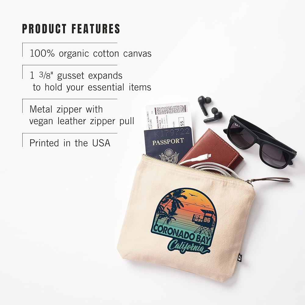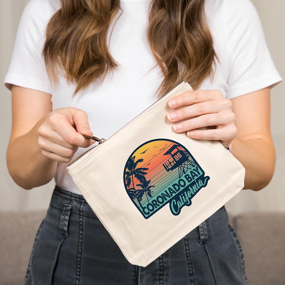 This original, high-quality cotton Zipper Pouch from Lantern Press boasts sharp detail and vivid imagery of Coronado Bay, California, Sunset stripes, Palm and Lifeguard Booth, , 100% Cotton Zipper Pouch, Travel Accessory, Go Bag.