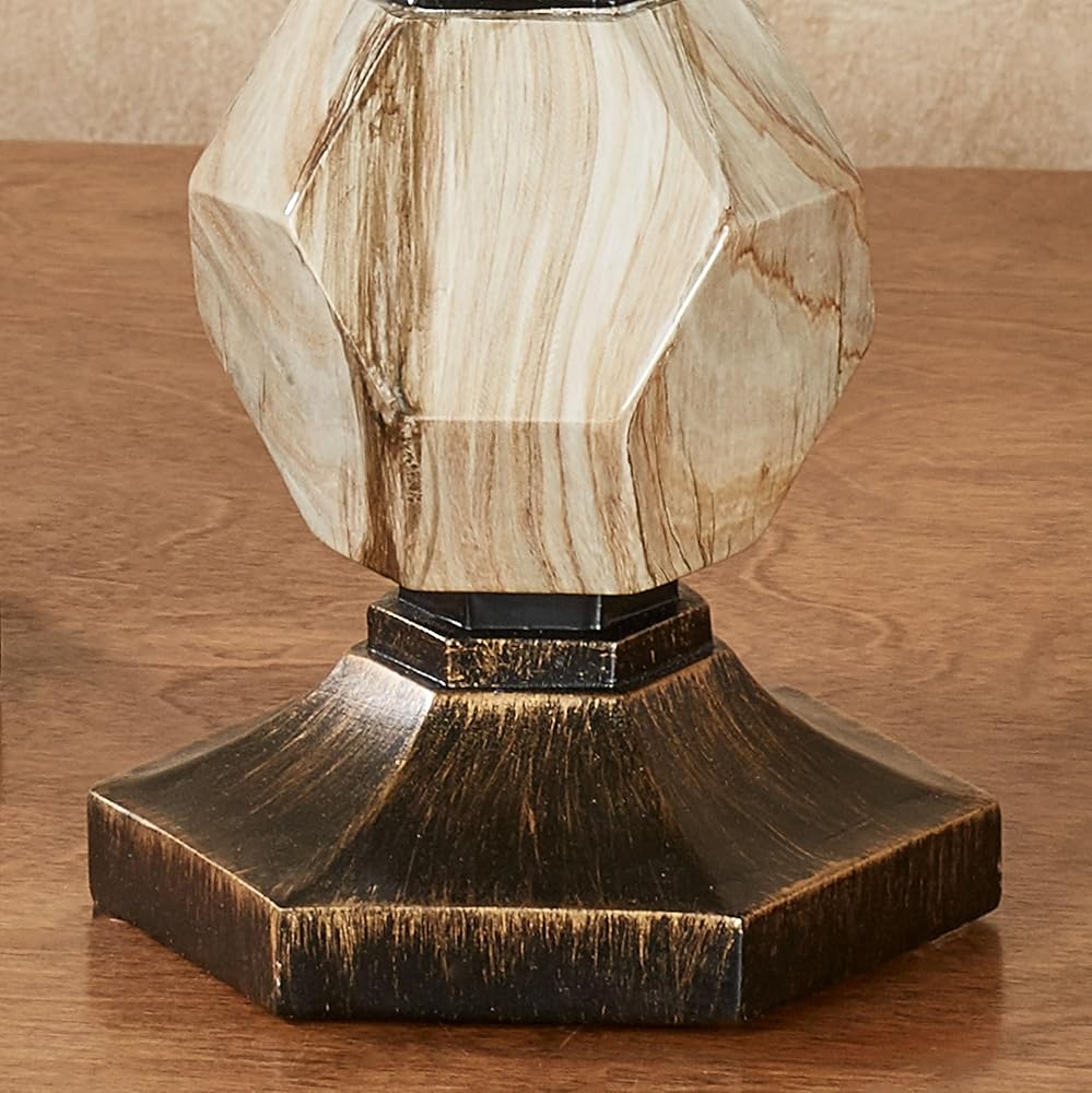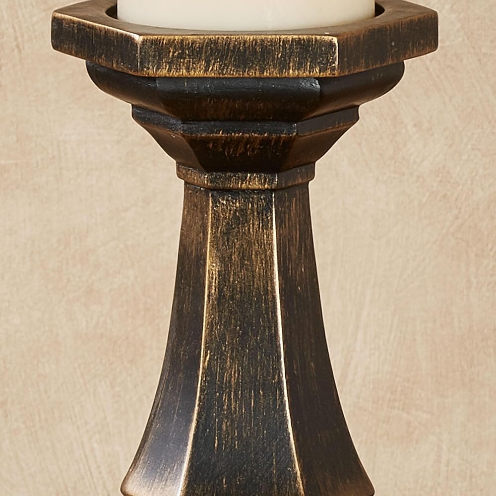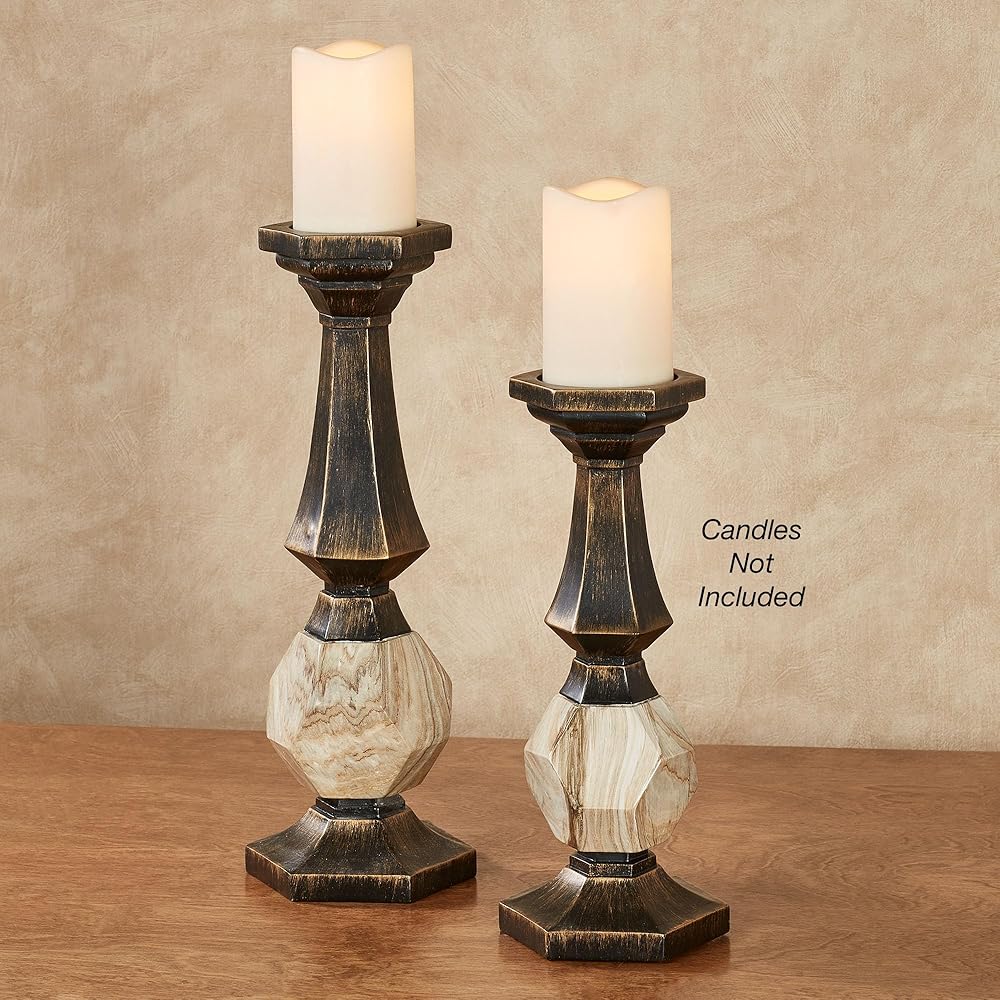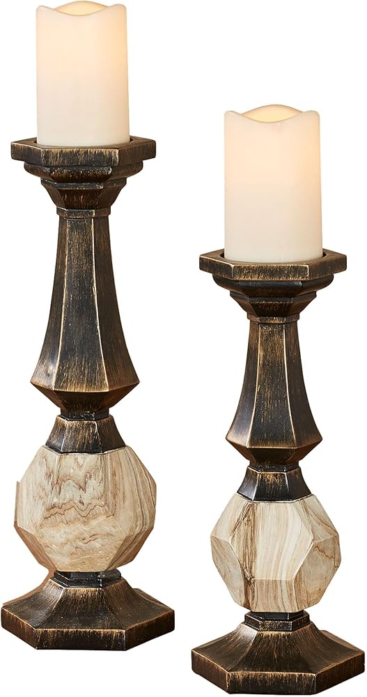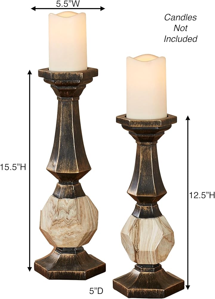 A fresh geometric style adorns the Zane Candleholder Set. Finished in black with gold highlighting, each resin accent features flared hexagon shapes and a center prism accent detailed in neutral faux grain designs. Each will hold your 3 dia. candle and measures 5.5 Wx5 Dx12.5 H and 15.5 H. Set of Two candleholders (one of each) Geometric candleholder set Finished in black with gold highlights Abstract prism accent with faux grains Each holds your 3 dia. candle.