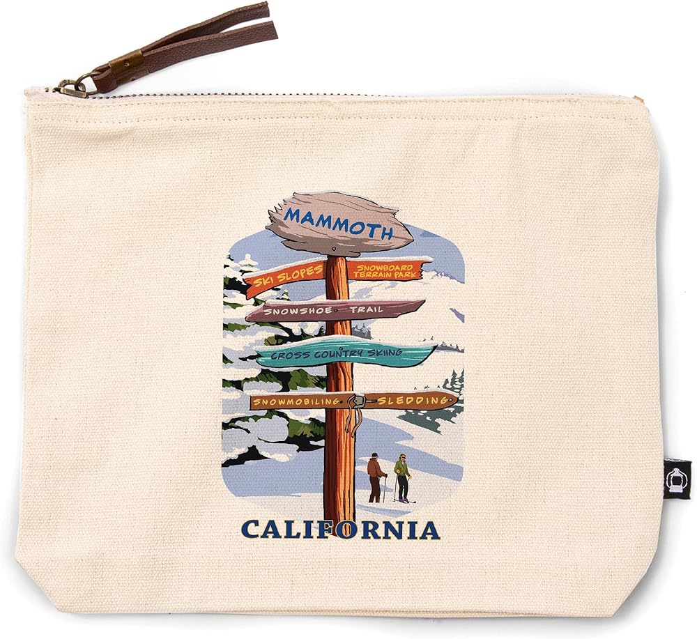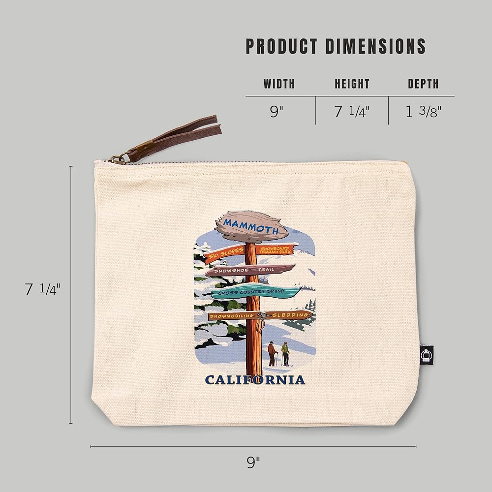 This original, high-quality cotton Zipper Pouch from Lantern Press boasts sharp detail and vivid imagery of Mammoth, California, Destination Signpost, Ski Snow, , 100% Cotton Zipper Pouch, Travel Accessory, Go Bag.
