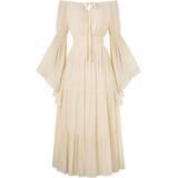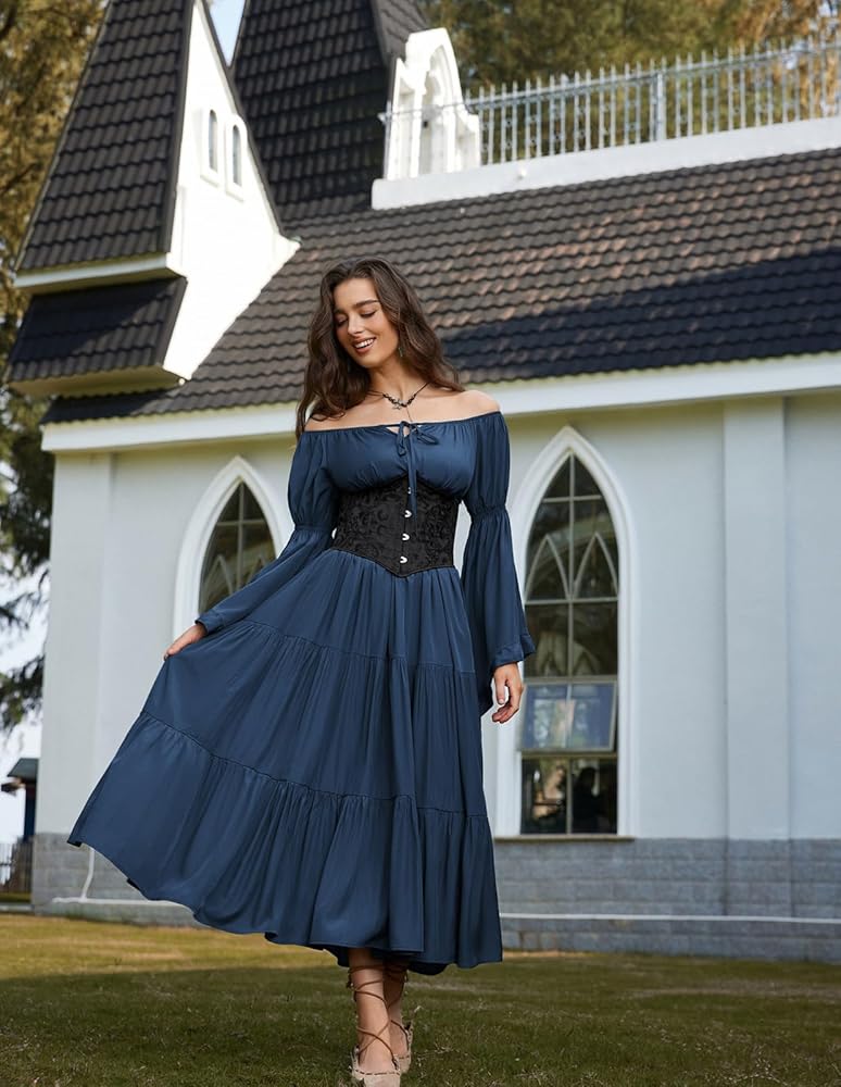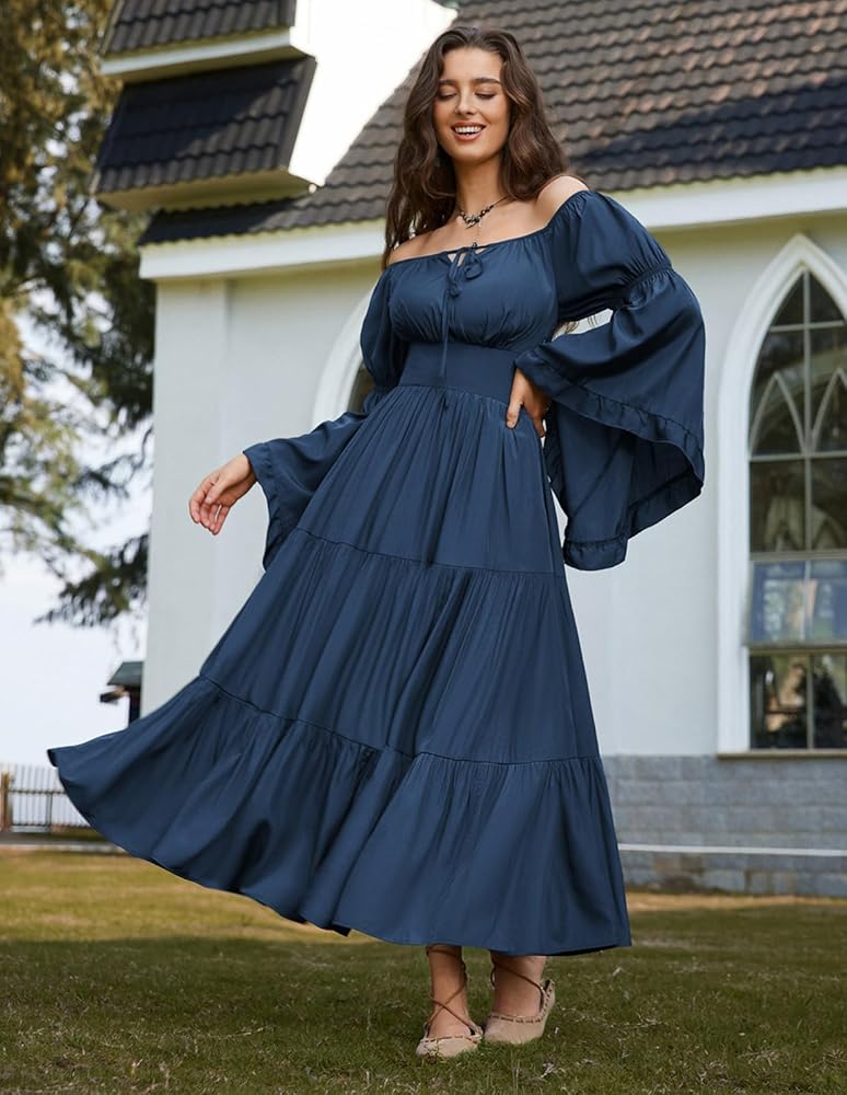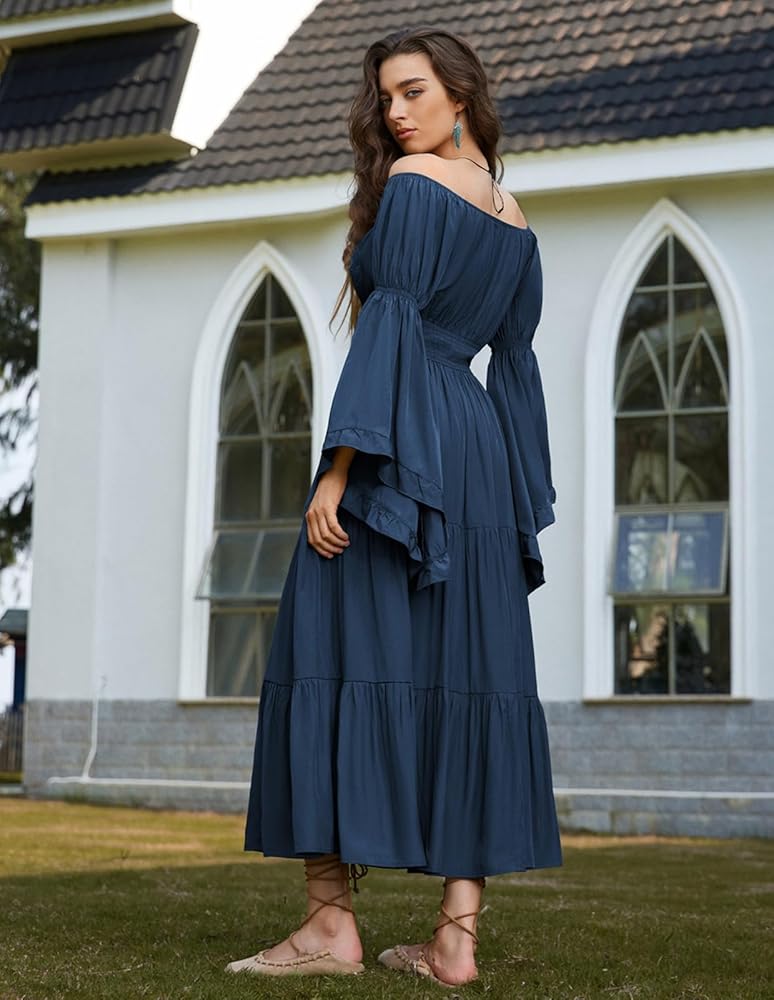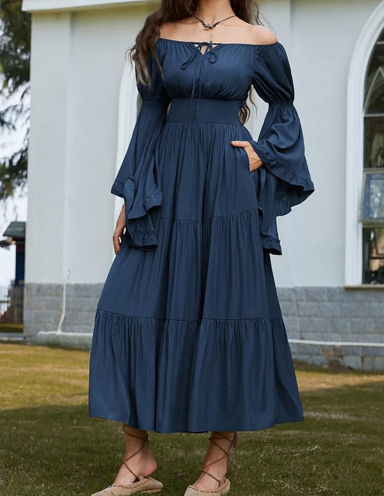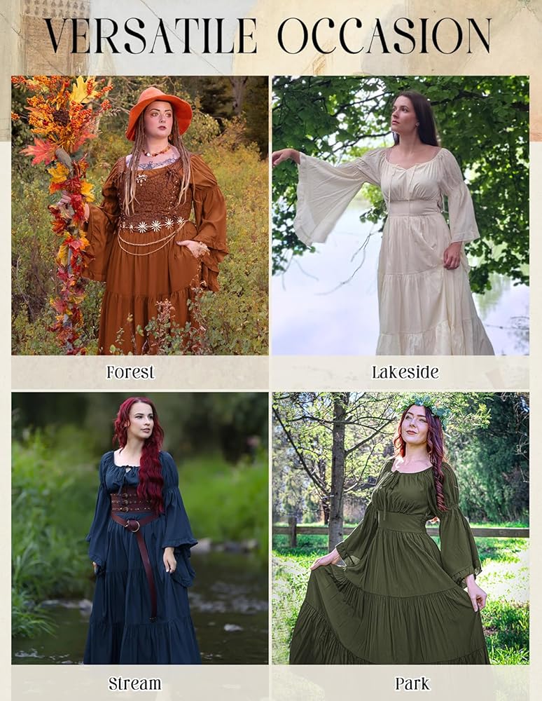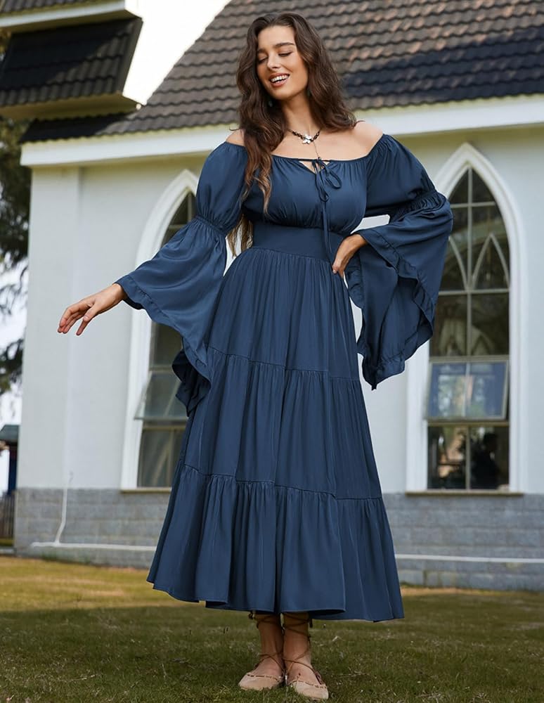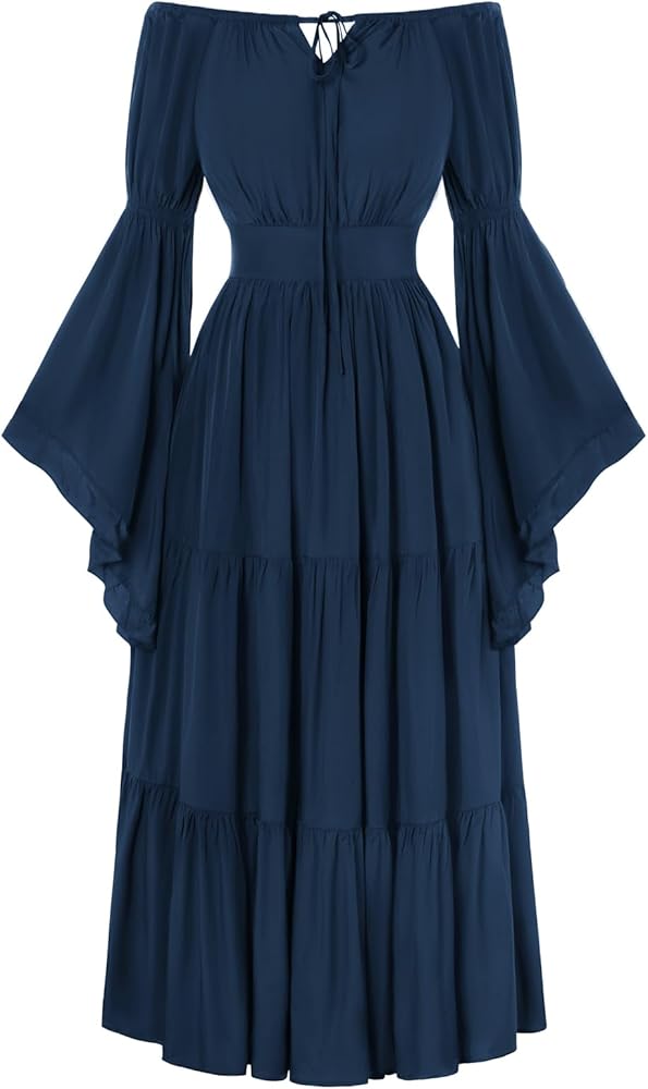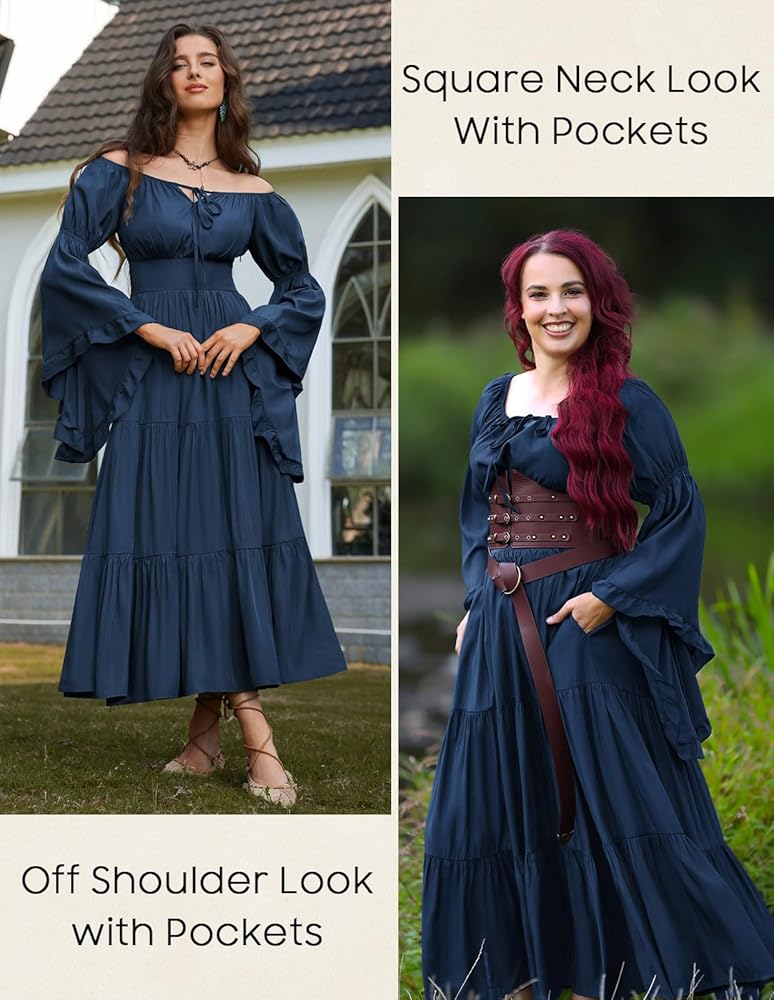 • الميزات: فستان النهضة الكلاسيكي يتميز بأكمام جرس مكشوفة ، وتصميم الكتف ، والخصر المرن المرن ، وتصميم تنحنح مكشوف الطبقات لإظهار سحرك الأنثوي