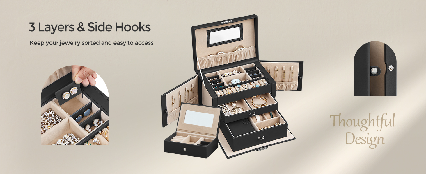 صندوق مجوهرات SONGMICS 3 طبقات، منظم مجوهرات مع درجين، حقيبة مجوهرات مع حقيبة سفر محمولة، مع مقبض، قابل للقفل، تخزين المجوهرات، هدية لأحبائك، أسود UJBC121B