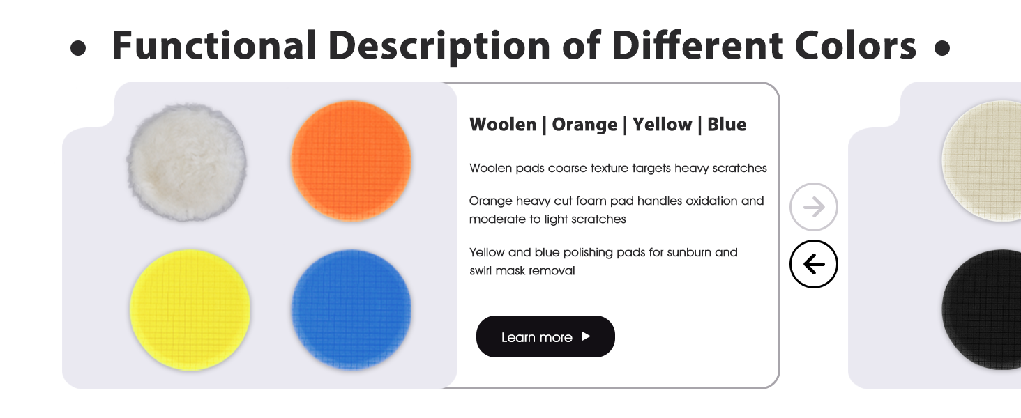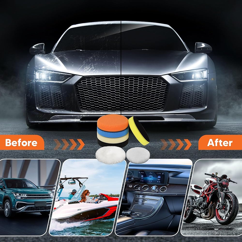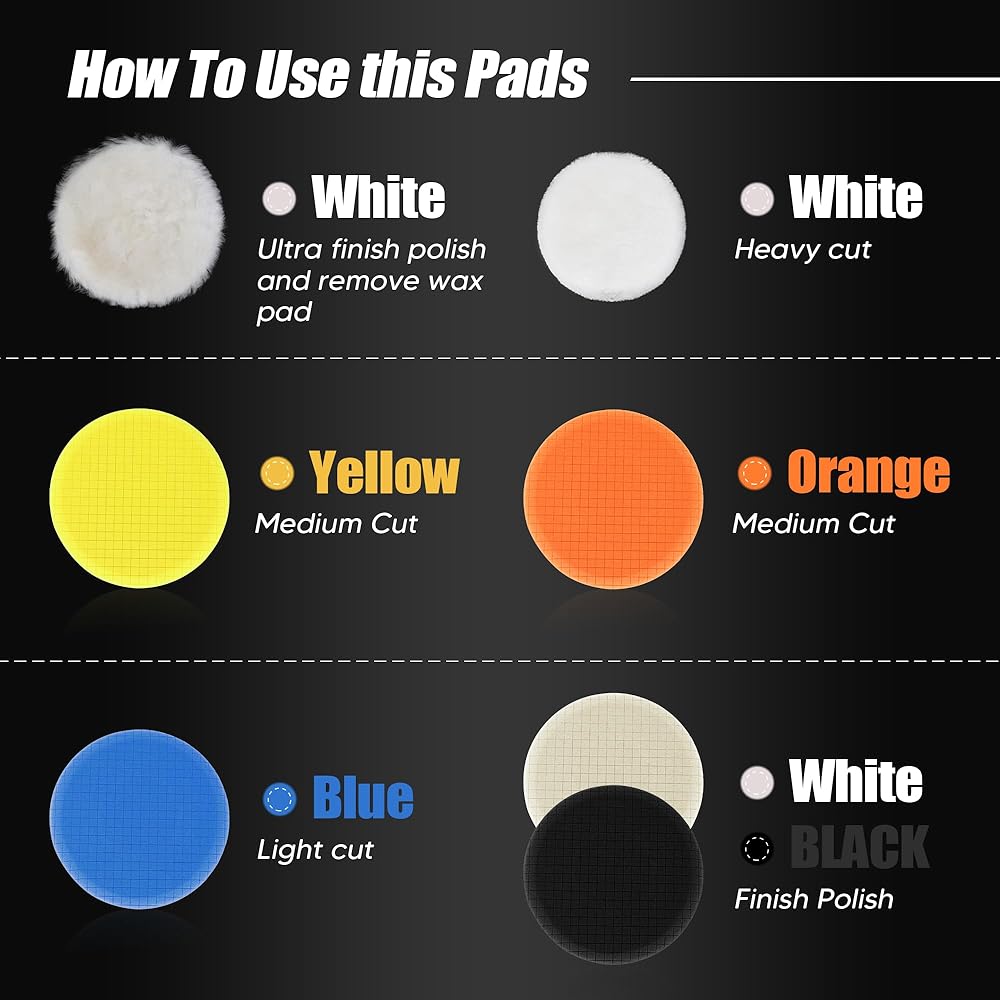 𝗙𝗨𝗡𝗖𝗧𝗜𝗢𝗡𝗔𝗟 𝗗𝗘𝗦𝗖𝗥𝗜𝗣𝗧𝗜𝗢𝗡 - تتضمن منصات التلزح 5 أجزاء من منصات تلميع الإسفنج المختلفة ، وسادة صوف 1 PC و 1 PC من الألياف الدقيقة يمكن أن تعيد سيارتك إلى لامعة. تستهدف وسادات الصوف الخشنة الخدوش الثقيلة ، في حين أن وسادة الرغوة الثقيلة البرتقالية تتبادل الأكسدة والخدوش المعتدلة إلى الخفيفة. منصات التلميع الصفراء والأزرق لإزالة قناع Sunburn و Dovirl ، تليها منصات التشطيبات البيضاء والأسود لتطبيق الشمع وتعزيز اللمعان. أخيرًا ، تقوم وسادة الألياف الدقيقة بمسح المخلفات أو الشموع أو المركبات. إذا كان لديك أي أسئلة حول استخدام المنتج ، فيرجى الاتصال بنا على الفور