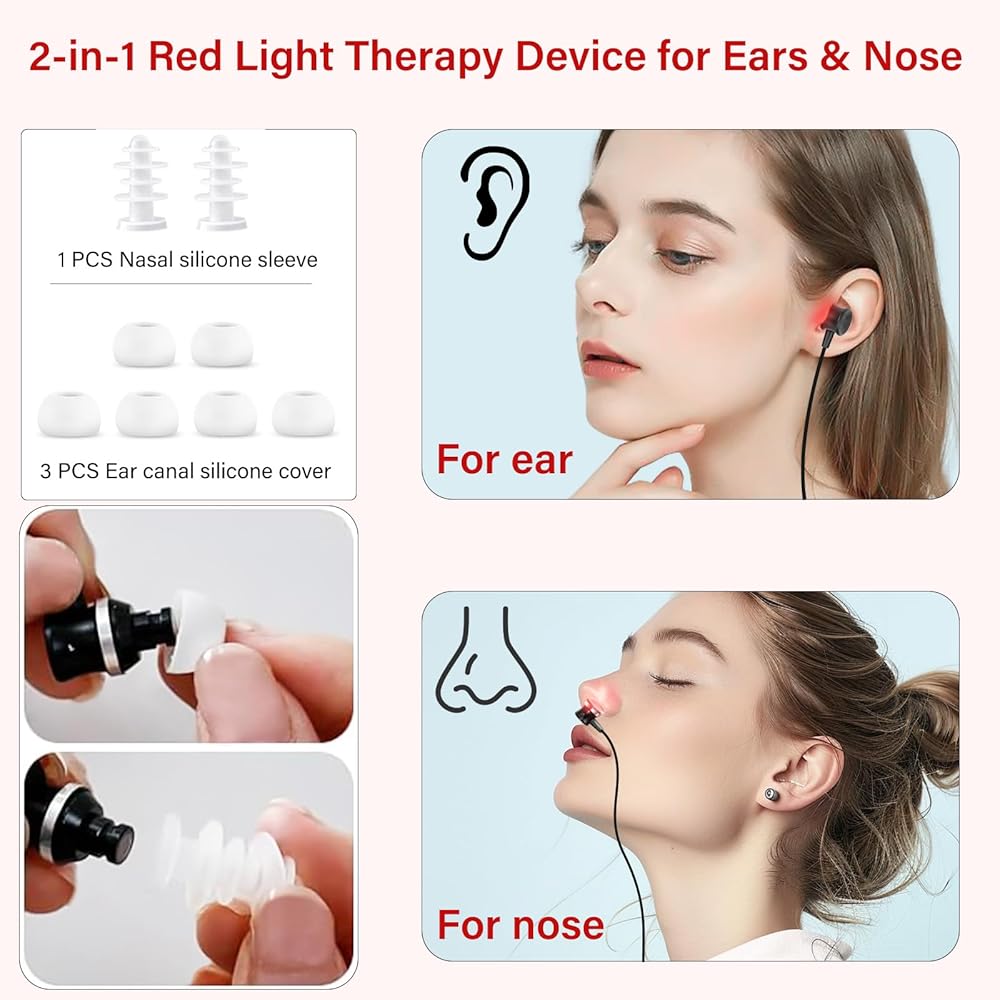 جهاز العلاج بالضوء الأحمر للأذنين والأنف-USB المحمولة معلقة 2 في -1--1 650 نيوتن متر مكالمات أذن حمراء أذن مع غطاء سيليكون قناة الأذن وأكمام الأنف ، وتخفيف الألم ، ودعم طنين