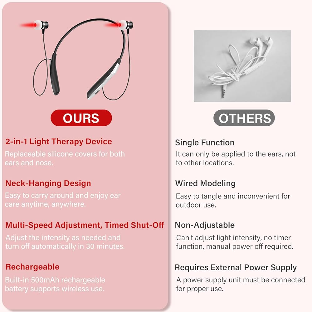 الإغاثة ذات العمل المزدوج: ارتداء سماعات أذن أو نصائح الأنف! يوفر العلاج بالضوء الأحمر 660nm للآذان والجيوب الأنفية للراحة المهدئة. يشمل 3 أزواج من نصائح الأذن السيليكون hypoallergenic + 1 زوج من النصائح الأنفية المريحة لراحتك.