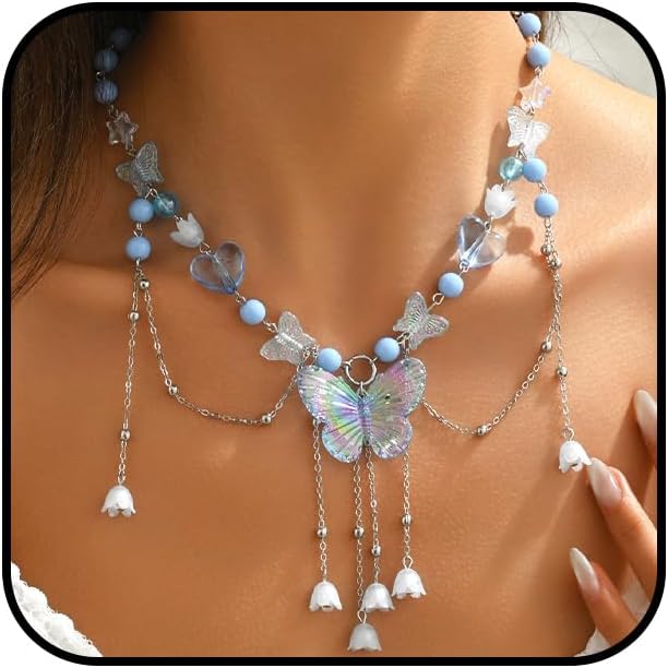 Y2K Butterfly Necklace: This layered butterfly choker brings nostalgic energy with its delicate purple butterflies, beaded flowers and tassel charms - a dreamy mix of vintage and modern fairy aesthetic that turns every outfit into a statement