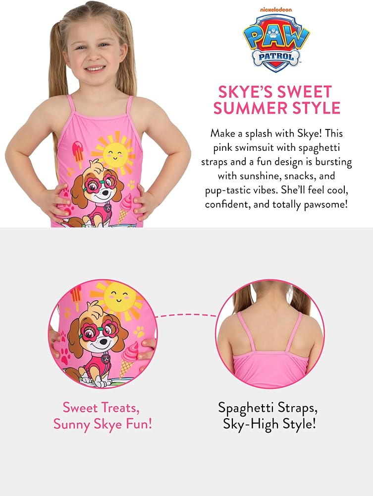 • Beach-Ready Skye Design: This adorable PAW Patrol swimsuit girls will love features Skye in a vibrant summer beach theme, complete with sun, ice lollies, and playful paw prints