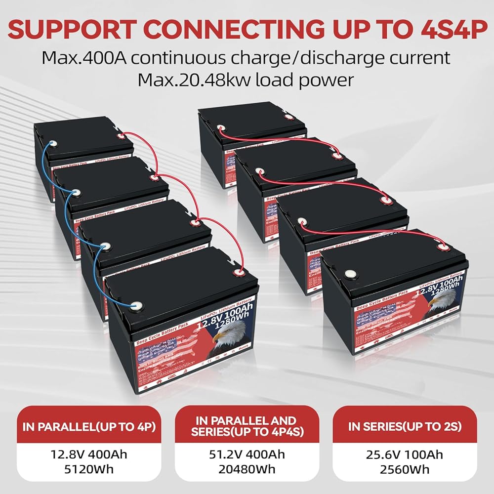 • 【يمكن توصيل اتصالات بطاريات LifePo4 ذات السعة العليا】 12V 100ah LifePo4 بالتوازي أو سلسلة لسعة أكبر. يُسمح للتوسع إلى 4s أو 4p بالحصول على سعة أقصى قدرها 400ah أو جهد أقصى قدره 48 فولت (51.2 فولت) .12V 100ah LifePo4 Lithium Batteries لديها مجموعة واسعة من الاستخدامات للربح ، وطاقة النسخ الاحتياطي ، والأنظمة الشمسية المنزلية خارج الشبكة ، والإضاءة. 12.8V 100AH الإصدار المصغر البطارية مناسبة لمحرك التصيد 30-70 رطل.